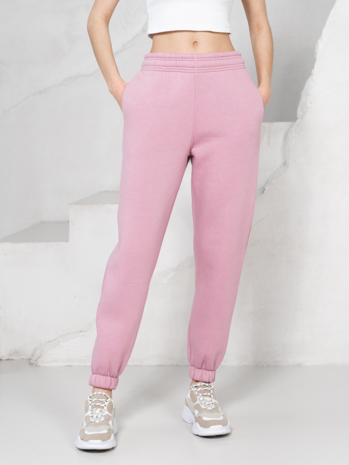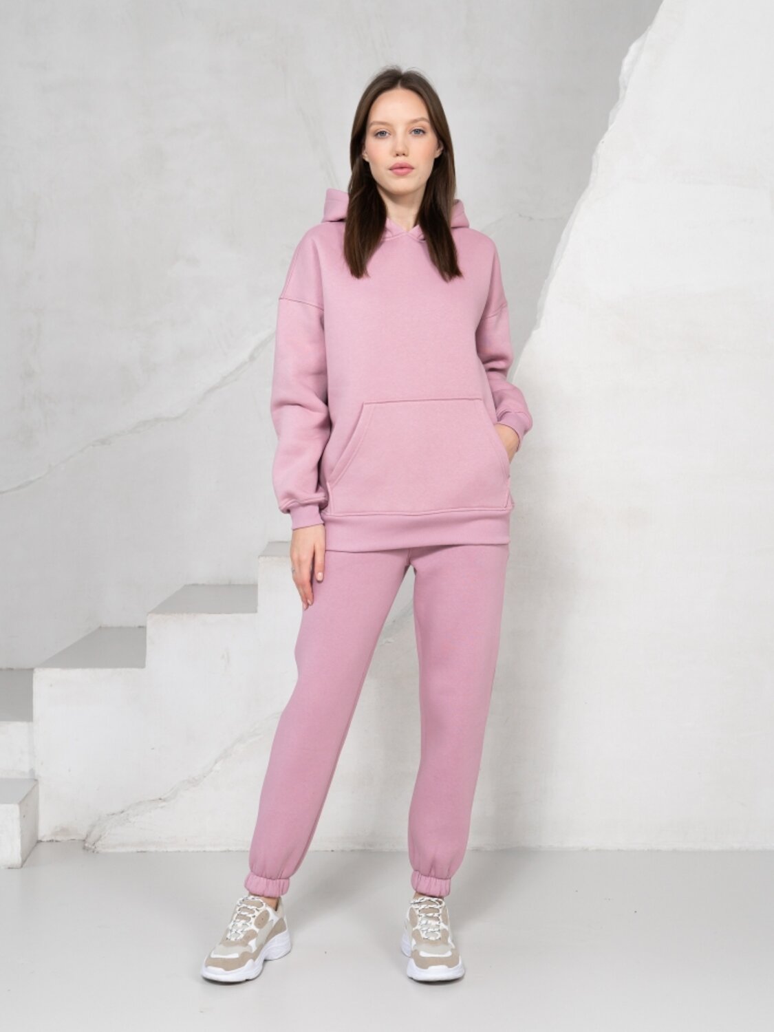 Комплект для повседневной носки в осеннее - зимний период состоит из брюк и толстовки. Толстовка свободного силуэта с карманом - кенгуру и капюшоном. Длинные рукава на манжетах, низкая линия плечевого шва. Брюки высокой посадки на резинках. Пояс брюк выполнен из резинки и регулируется шнуром. Зимой такой костюм лучше всего сочетать с классическим верхом, например, с длинным пальто, шубкой-чебурашкой или пуховиком, причем капюшон можно всегда эффектно вытащить поверх воротника верхней одежды. Костюм пошит из очень комфортной к телу ткани на основе 80 % хлопка – футер начес. Лицевая сторона очень мягкая и гладкая, а плотный и густой ворс изнанки согреет в прохладную погоду и защитит от ветра.