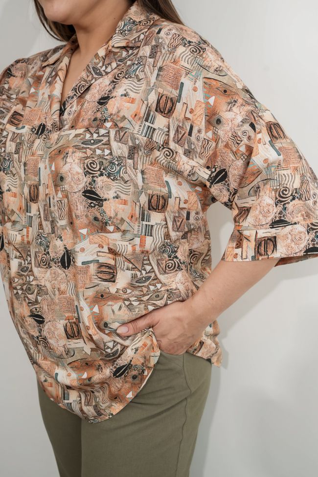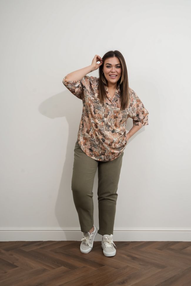 светло-коричневый Свободная блуза из легкой хлопчатобумажной ткани, длиной до линии бедер.   Горловина оформлена отложным воротником рубашечного типа без стойки, по переду отрезная кокетка. Рукава втачные длиной 3/4 с манжетой. Низ с актуальным закруглением.Блузка больших размеров обеспечит комфорт и уют в любое время года.