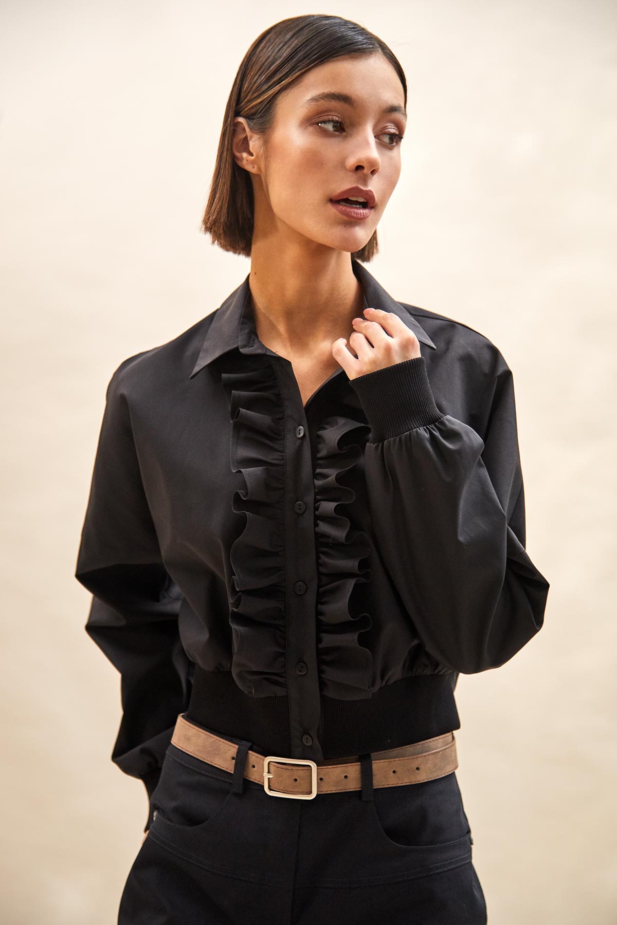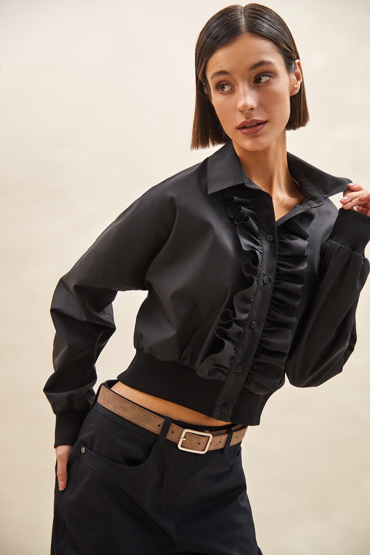 - застежка на планку с пуговицами и двумя оборками вдоль планки;