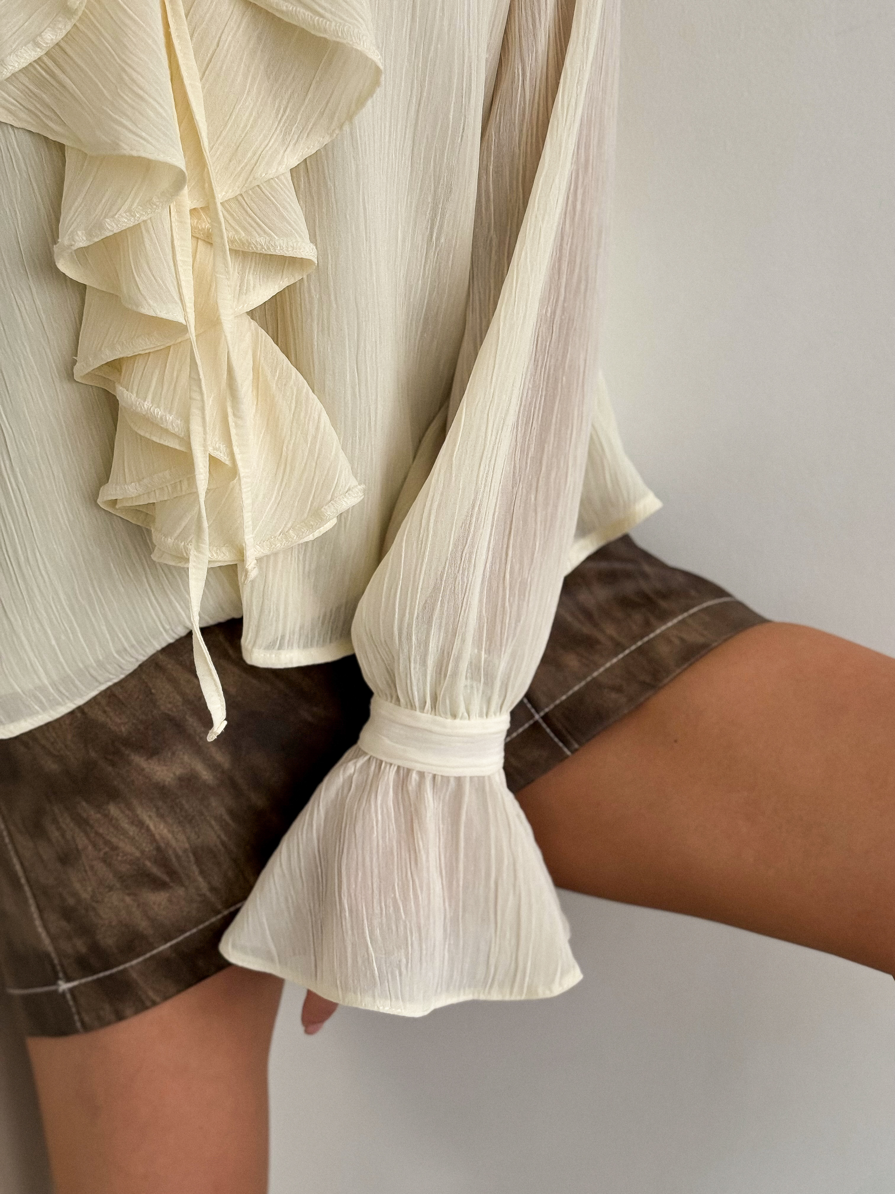 Блуза, декорированная рюшами. Воротник-чокер с завязками. Рукава с манжетами на застежку пуговицу.