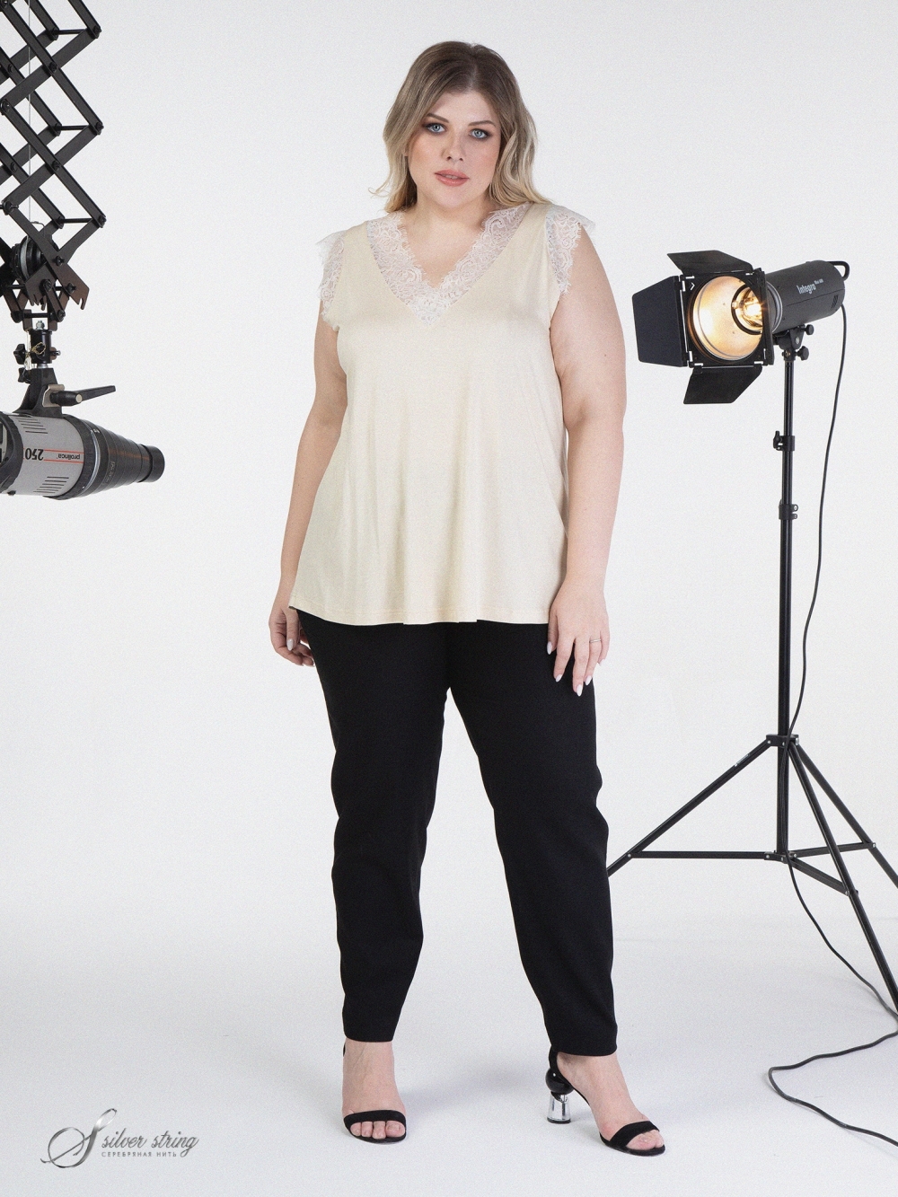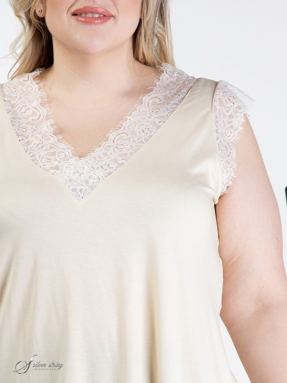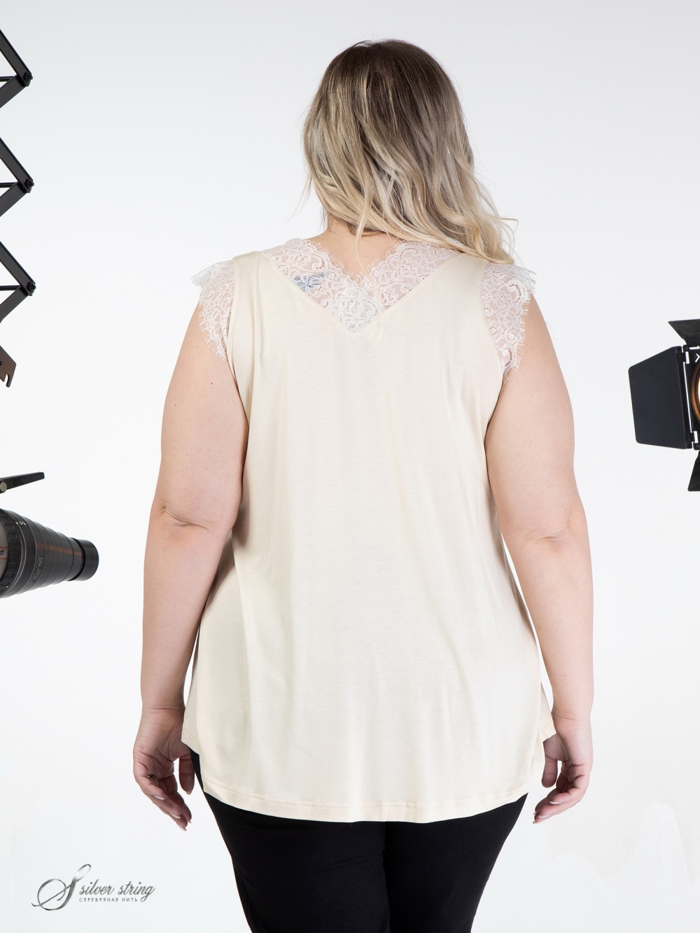 Элегантная трикотажная блуза без рукавов, трапециевидного силуэта, выполнена из шелковистого вискозного полотна. Модель с У-образным вырезом горловины. Горловина и пройма изделия обработаны нежным кружевом. Это базовая модель, которая станет незаменимой при создании разнообразных комплектов с жакетами, блузонами и кардиганами.