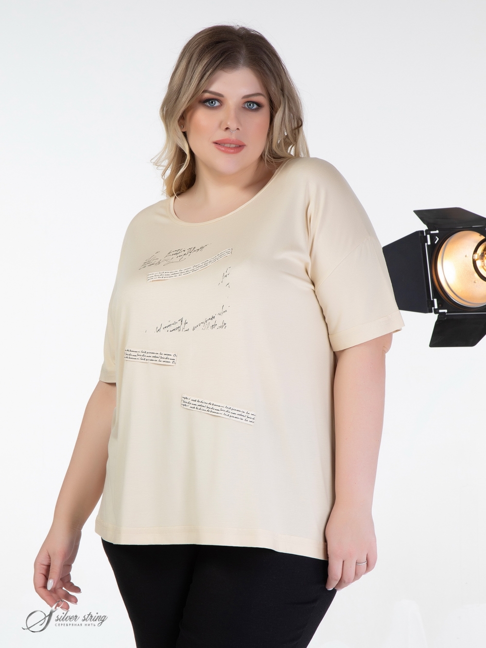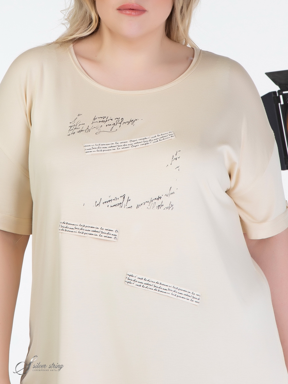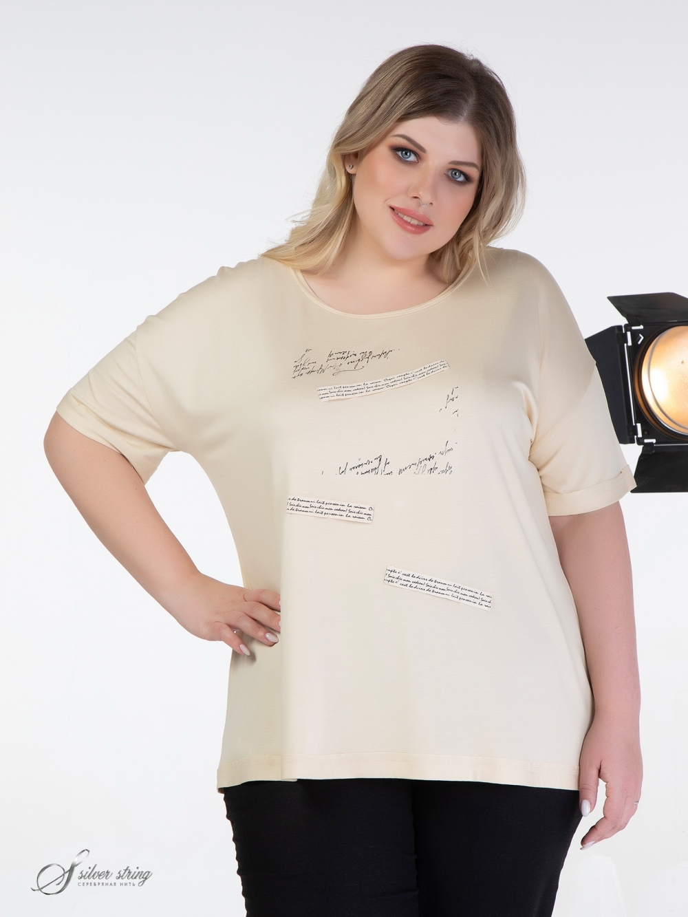 Оригинальный блузон Т-образного силуэта выполнен из высококачественного вискозного полотна. Модель с удлиненной линией плеча и рукавом, длиной за локоть. Низ рукава оформлен отворотом. Линия горловины округлой формы. Открытый срез горловины настрочен на лицевую сторону. На полочке расположен оригинальный рисунок, сочетающий в себе термопринт и декоративную тесьму. Модель можно использовать как самостоятельное изделие, так и для создания комплектов с различными жакетами, кардиганами и блузонами.