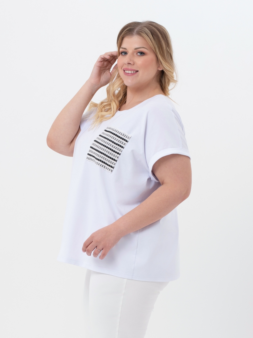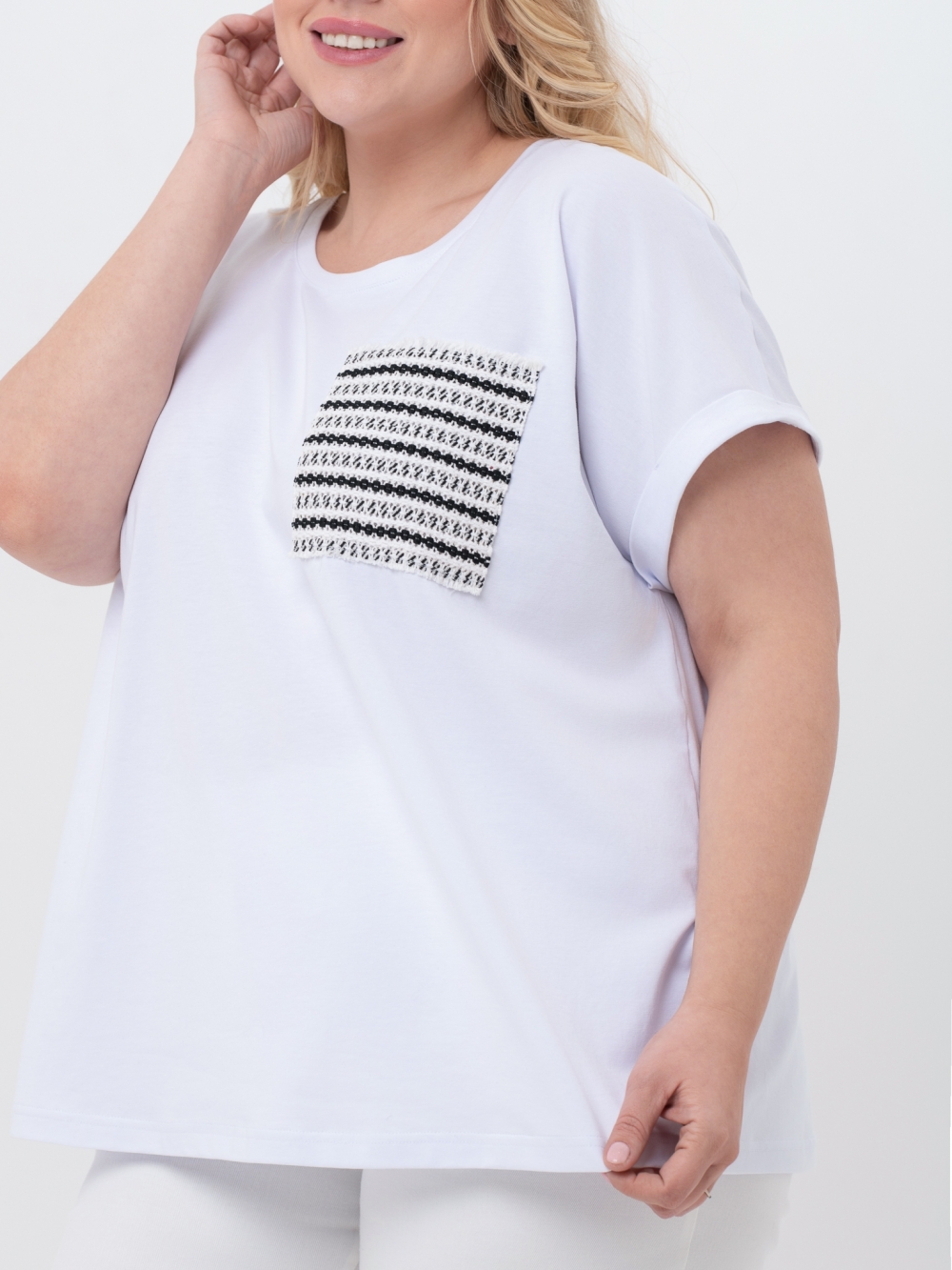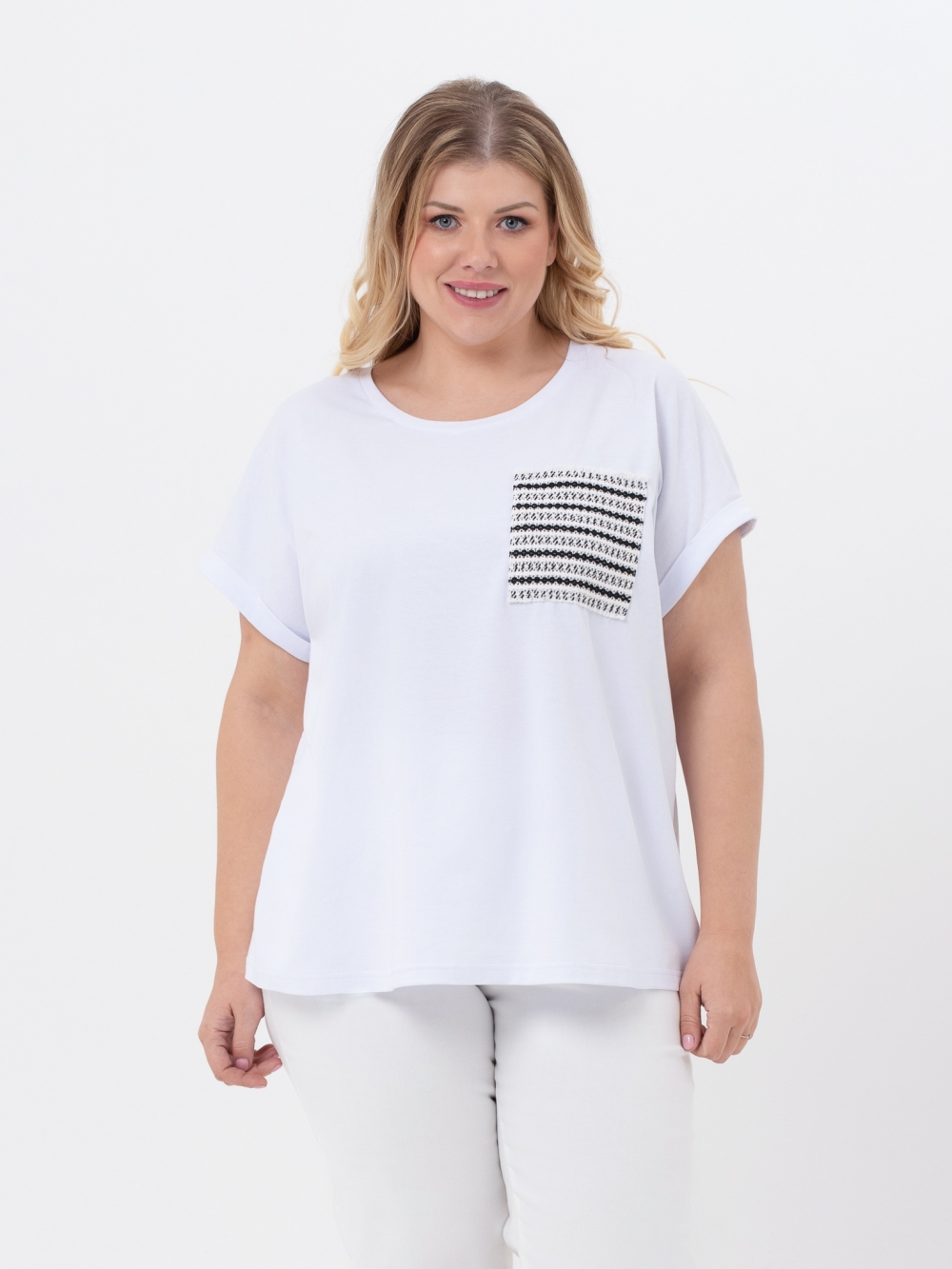 Удобная трикотажная футболка прямого силуэта с круглой линией горловины и коротким рукавом покроя кимоно. Модель выполнена из качественного, натурального трикотажного полотна. Горловина обработана узкой планкой. Нагрудный карман из отделочной ткани претендует на роль основного акцента в образе. Футболка является самым демократичным видом одежды в мире, её носят люди всех возрастов, национальностей и достатка. Это базовая вещь, которая станет незаменимой при создании разнообразных комплектов с жакетами, блузонами и кардиганами.