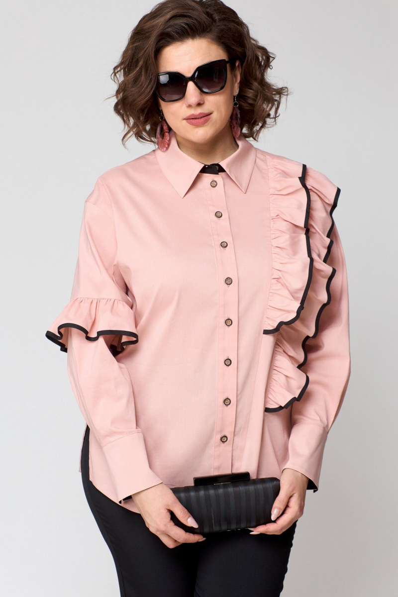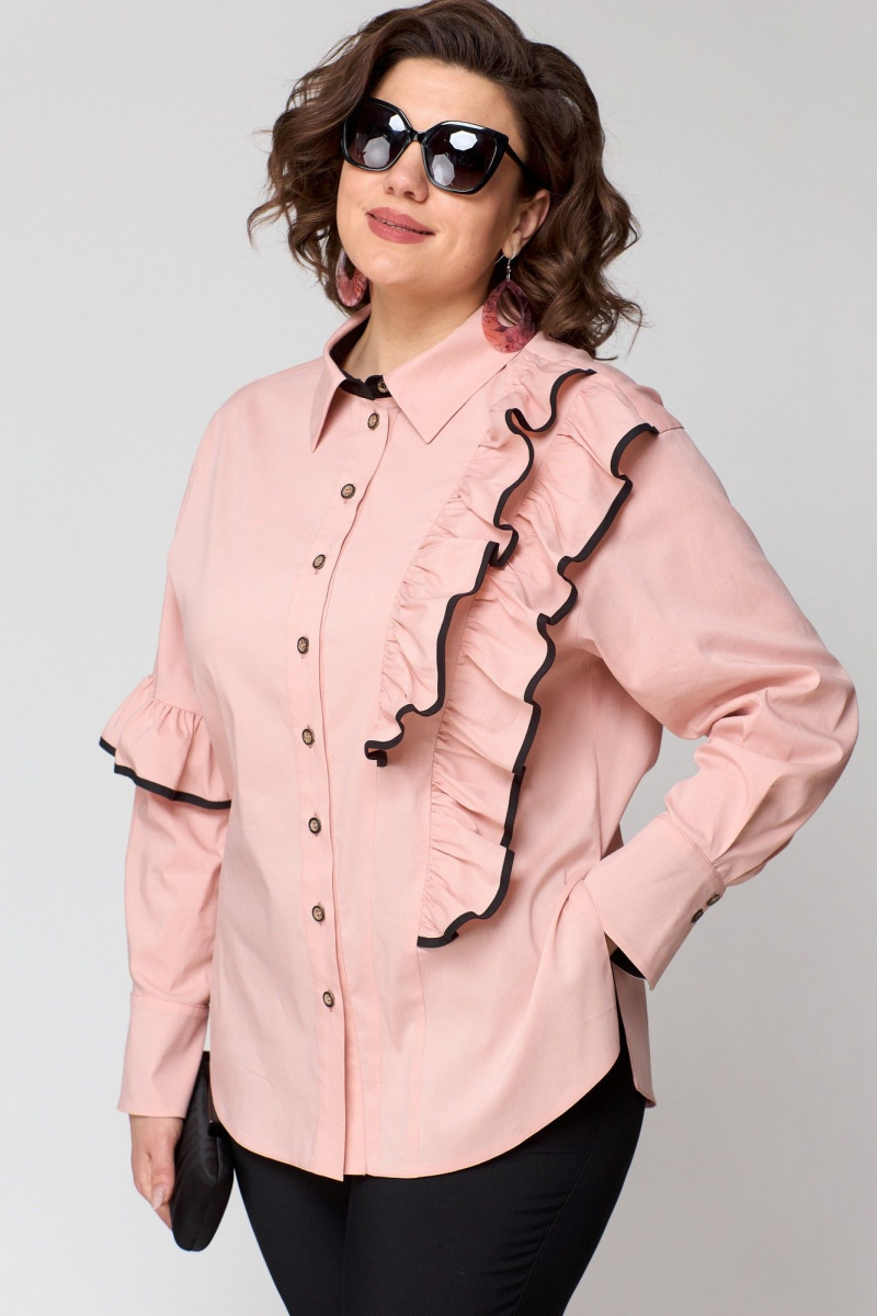 Блузка женская нарядно-повседневная прямого силуэта выполнена из хлопка в сочетании с отделкой. Вырез горловины воротник на стойке рубашечного типа, застежка доверху на обметанные петли и отделочные пуговицы. Плечо спущенное, рукав втачной по низу на притачной манжете. В правый рукав вставлена рюша из отделочной ткани. По полочке ассиметричный подрез с двумя рюшами. В боковых швах блузы обработаны разрезы.