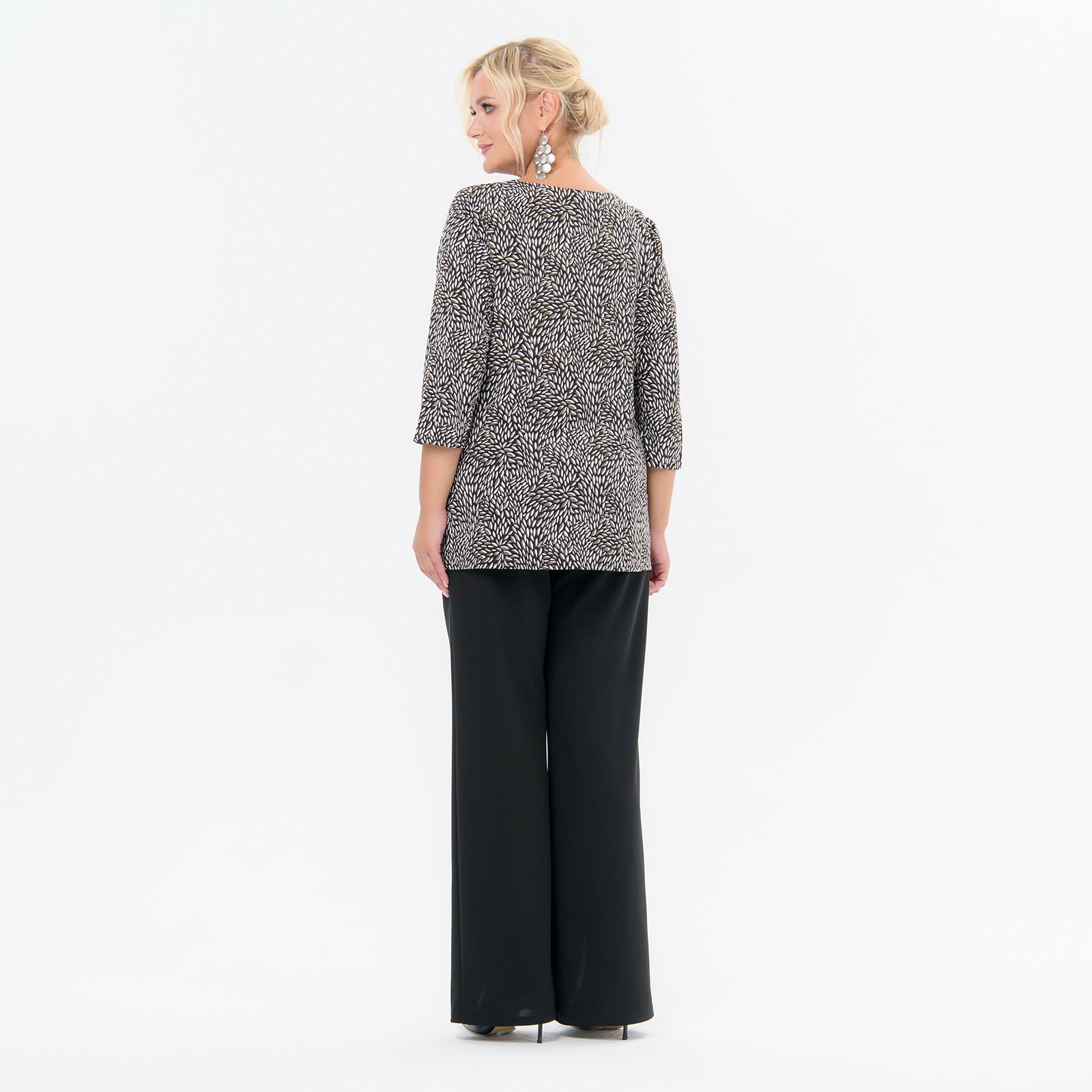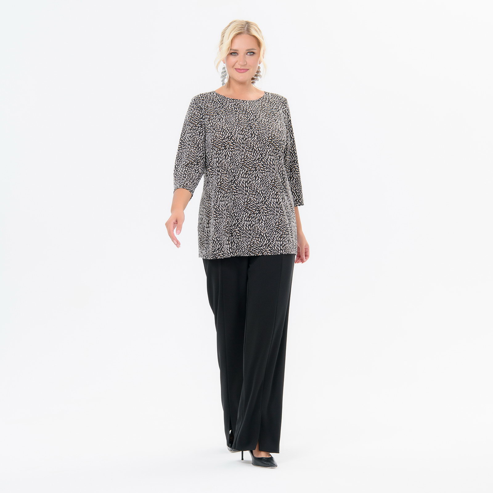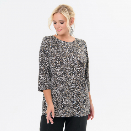 Базовая блуза из принтованного трикотажа "масло". Силуэт полуприлегающий. Вырез горловины округлый. Рукав 3/4.