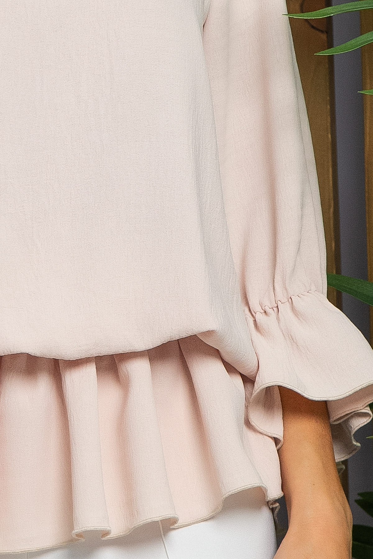 Однотонная бежевая блуза — это прекрасная основа для создания разнообразных образов. Рукав три четверти, по низу украшен воланом. Само изделие также украшено по низу воланом, что придает образу легкости и воздушности. Горловина отработана резинкой, это позволяет спустить блузу на плечи, что придаст образу кокетства. Отлично будет смотреться как с брюками, так и с джинсами.