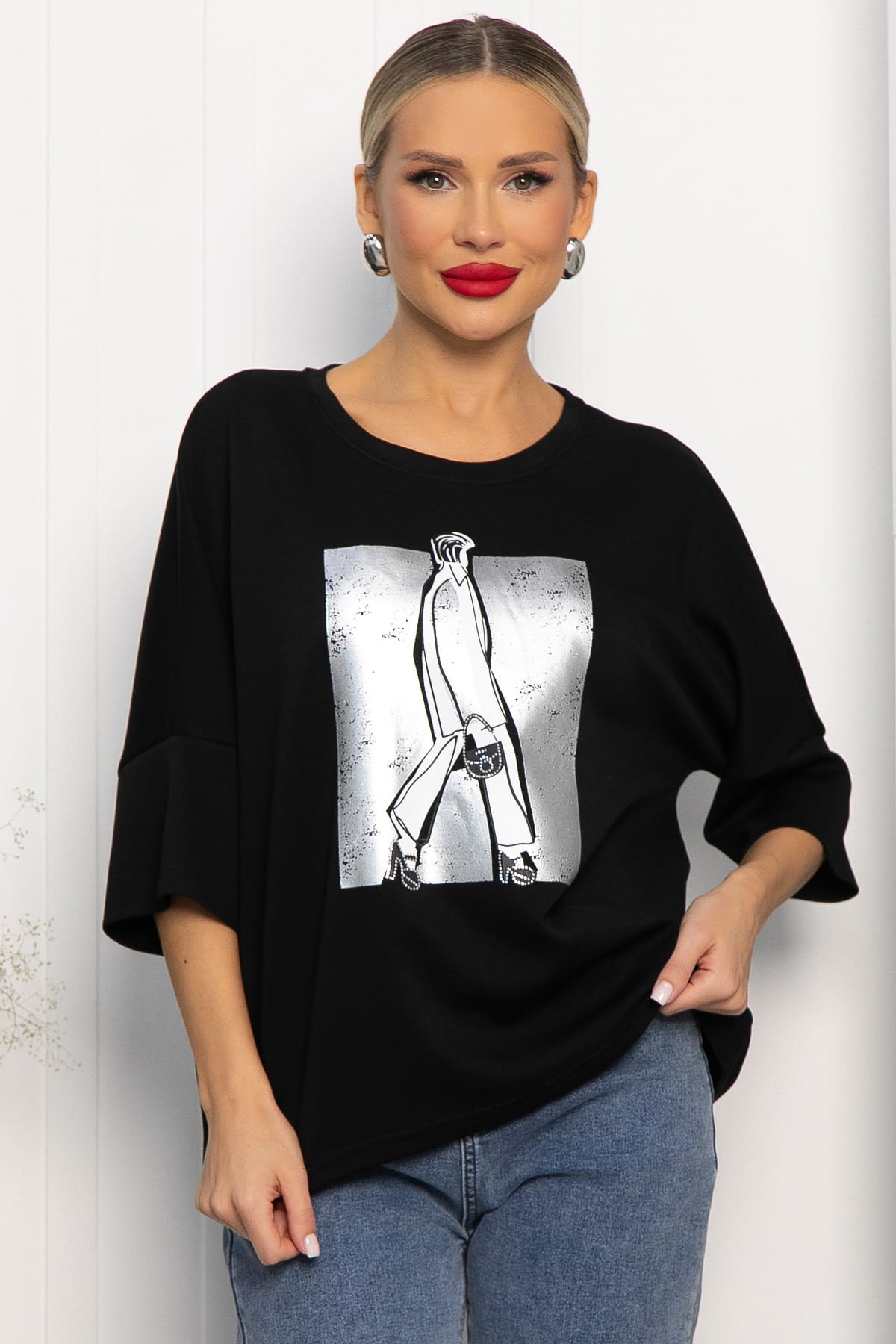 Женская блузка с оригинальным дизайном сочетает в себе стильный внешний вид и исключительный комфорт. Яркий и оригинальный принт, украшенный стразами и металлизированным напылением, добавляет уникальности. Выполненная из приятного трикотажа, она идеально подходит для повседневных образов или активного образа жизни. Станет отличным акцентом в вашем гардеробе, добавляя нотки стиля в любой случай!