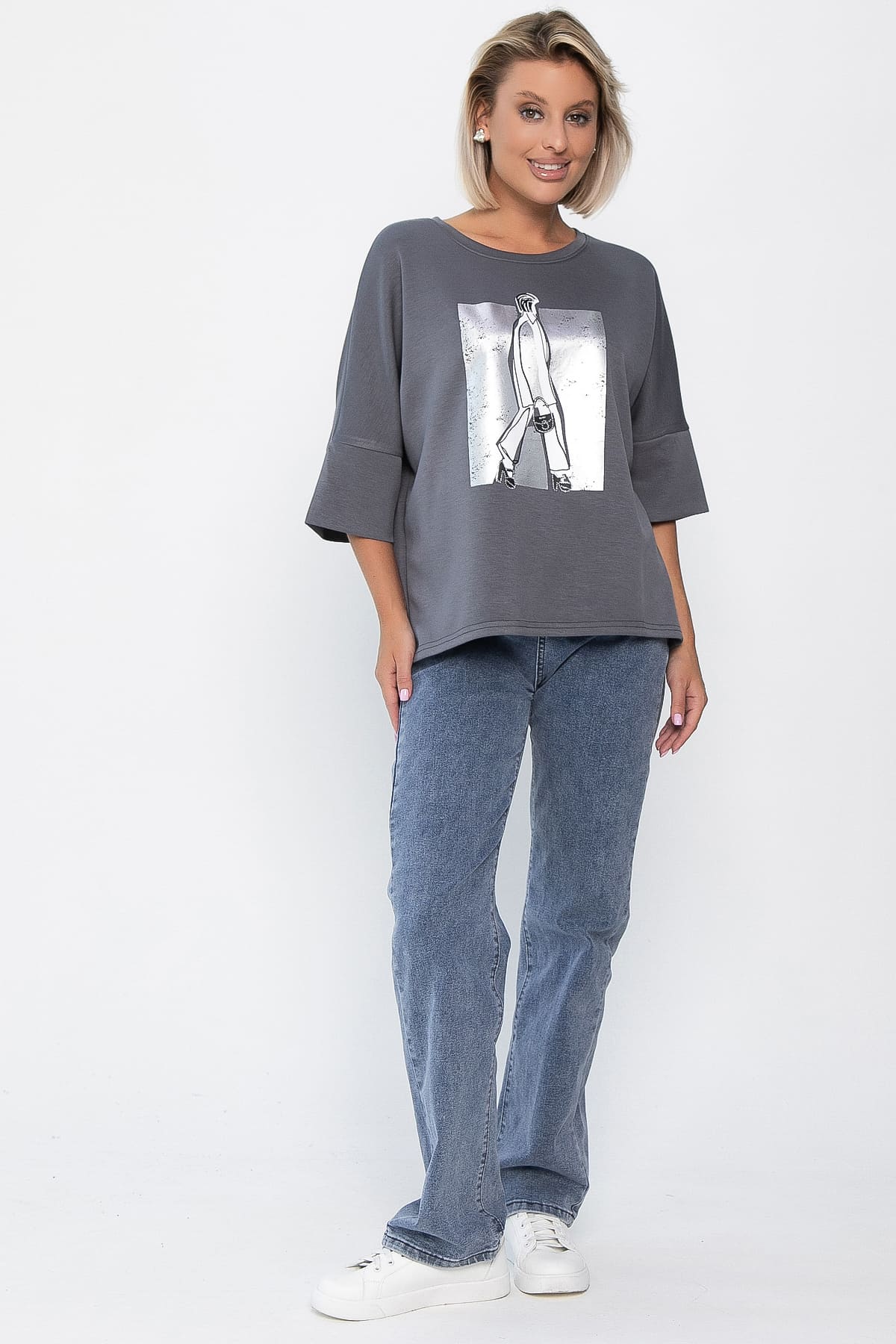 Женская блузка с оригинальным дизайном сочетает в себе стильный внешний вид и исключительный комфорт. Яркий и оригинальный принт, украшенный стразами и металлизированным напылением, добавляет уникальности. Выполненная из приятного трикотажа, она идеально подходит для повседневных образов или активного образа жизни. Станет отличным акцентом в вашем гардеробе, добавляя нотки стиля в любой случай!