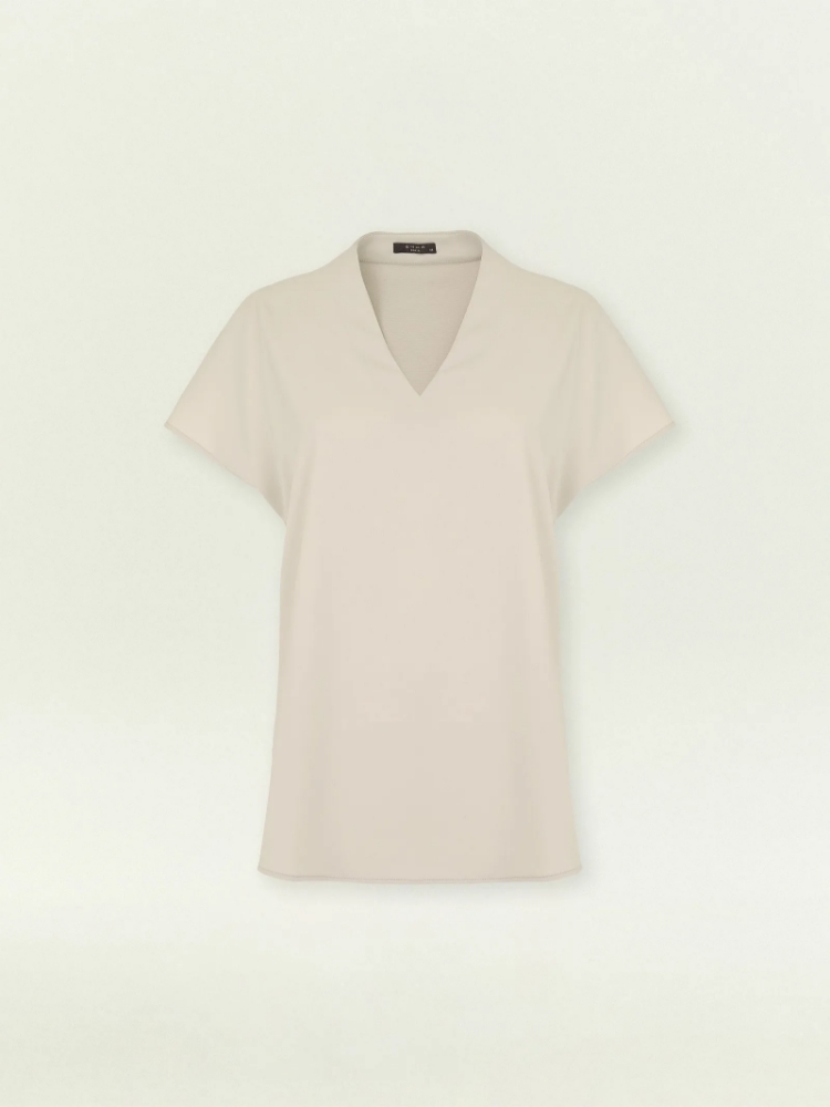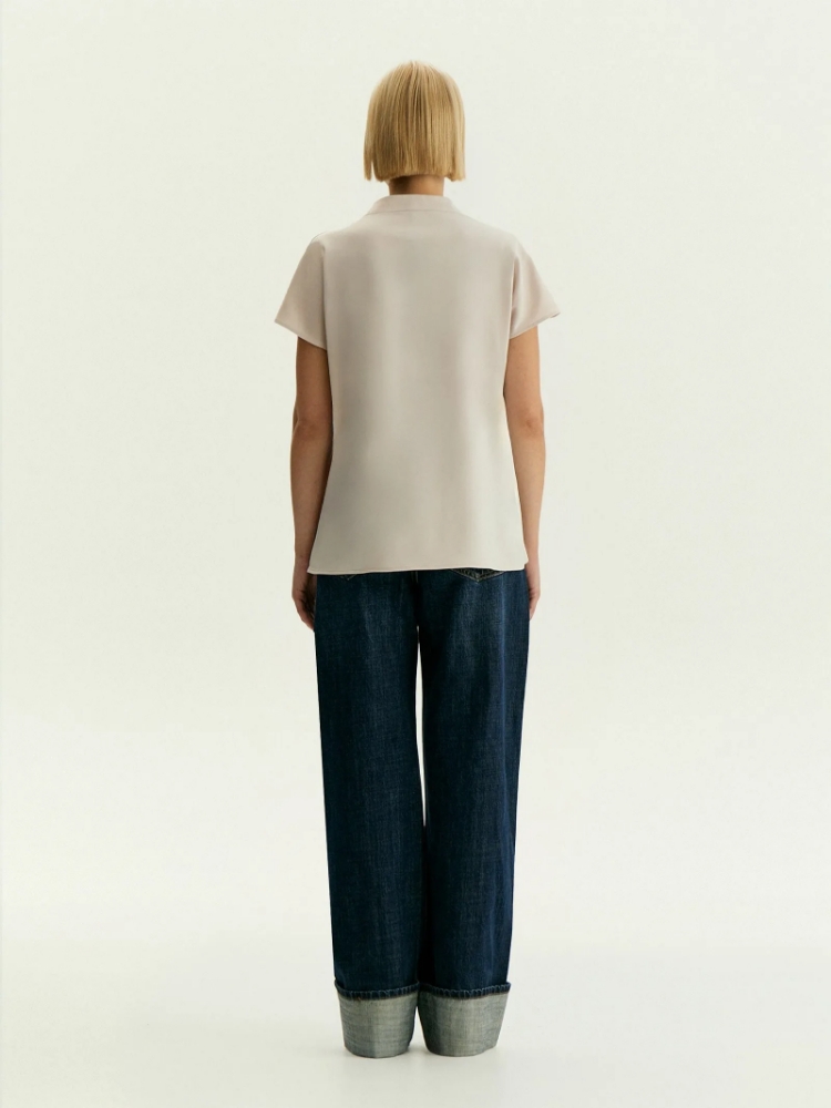 Базовая блузка в молочно-бежевом цвете. Выполнена из материала с содержанием вискозы, без подкладки. Модель прямого кроя с коротким рукавом отличает элегантная стойка, переходящая в небольшой и изящный V-образный вырез. Внизу по бокам изделия располагаются аккуратные разрезы. Длина позволяет носить блузку как навыпуск, так и заправленной