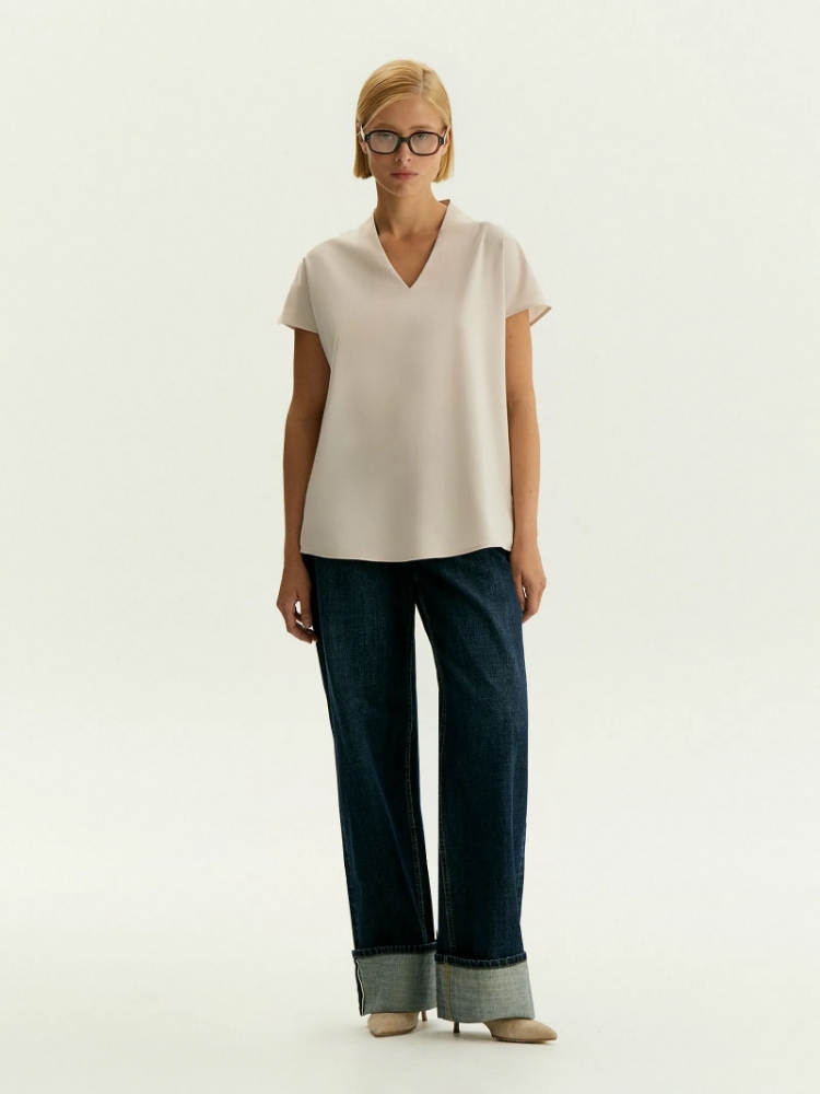 Базовая блузка в молочно-бежевом цвете. Выполнена из материала с содержанием вискозы, без подкладки. Модель прямого кроя с коротким рукавом отличает элегантная стойка, переходящая в небольшой и изящный V-образный вырез. Внизу по бокам изделия располагаются аккуратные разрезы. Длина позволяет носить блузку как навыпуск, так и заправленной