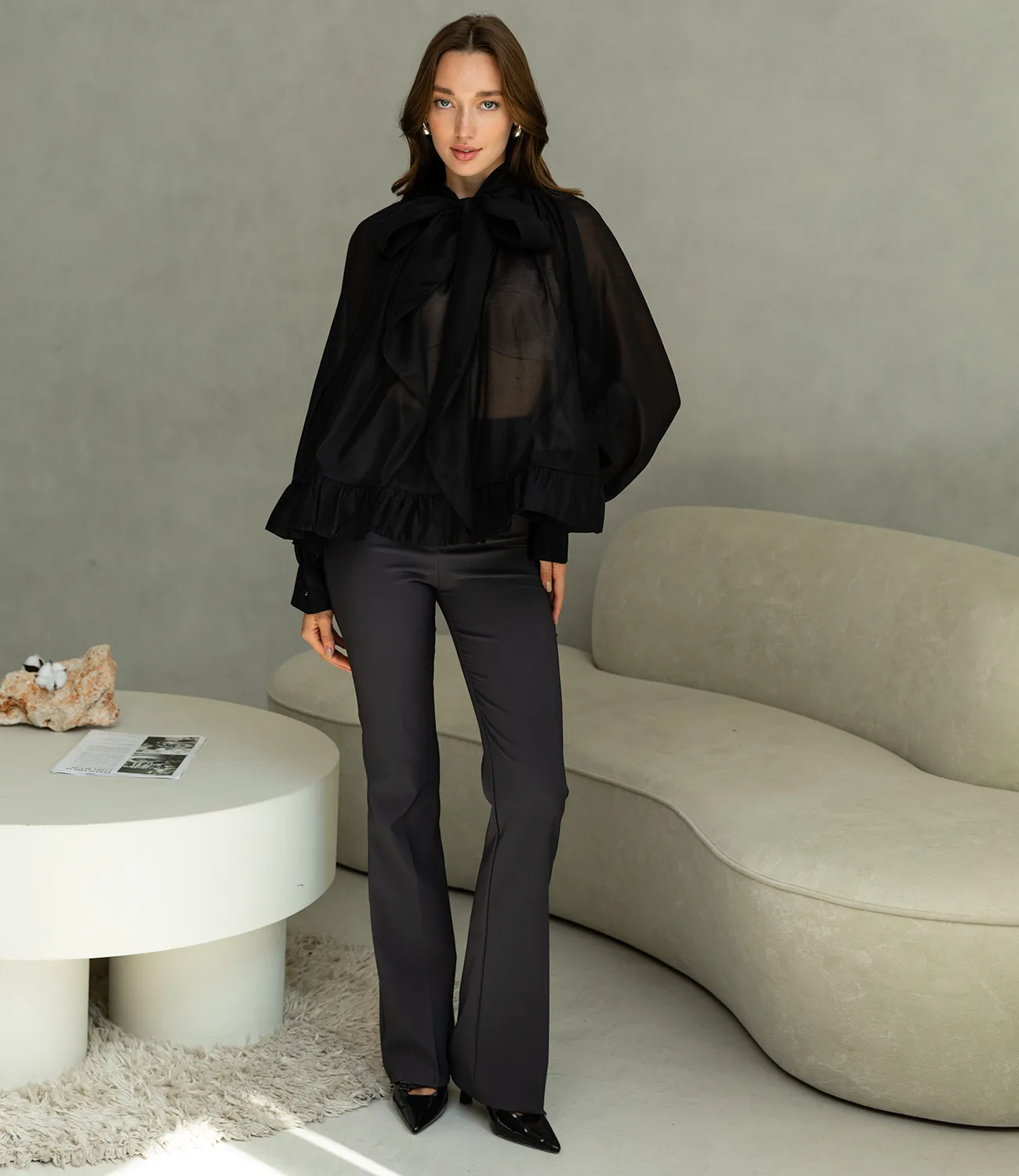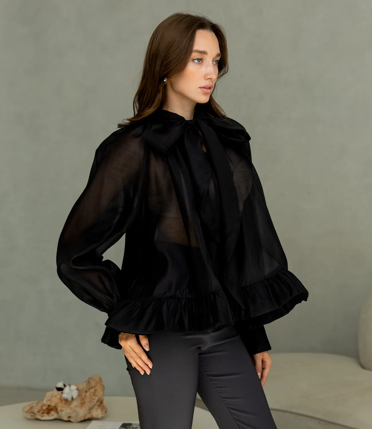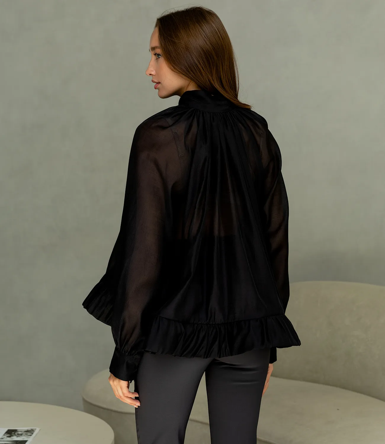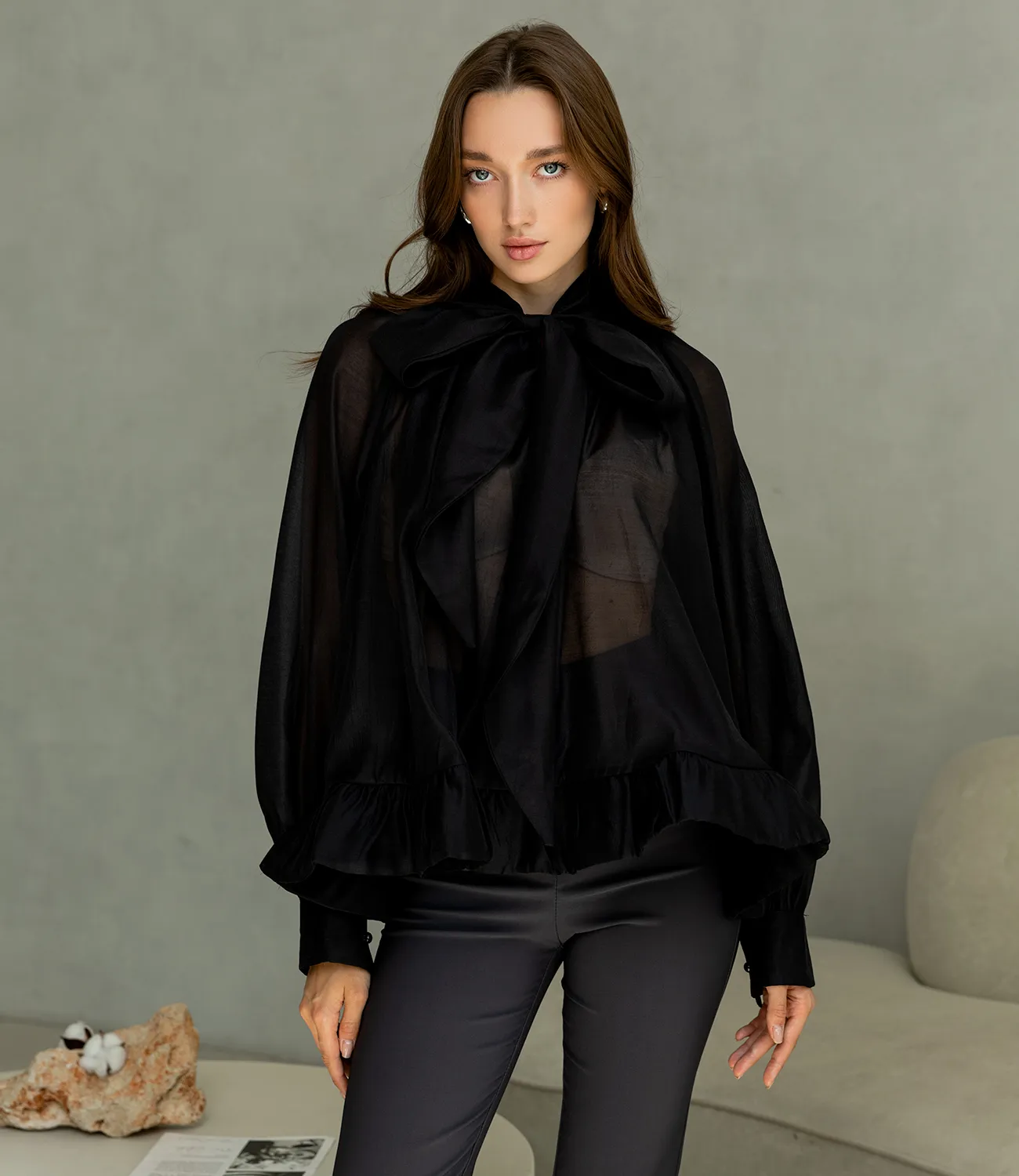 Блуза — это незаменимый элемент гардероба, который подчеркнет индивидуальность и стиль каждой женщины. Эта прекрасная модель, выполненная из 100% полиэстера, отличается легкостью и полупрозрачной текстурой, создавая воздушный и нежный образ. Изюминкой данной блузы являются пышные длинные рукава с широкими манжетами, которые добавляют элегантности и шика. Высокий воротник с рюшами и длинные завязки, которые можно стильно завязать в бант, придают изделию романтичный и изысканный вид. Эта блуза станет идеальным выбором как для офисных, так и для торжественных мероприятий, позволяя каждой женщине выглядеть безупречно в любых ситуациях. Мы уверены, что эта модель привлечет внимание ваших покупательниц, ценящих сочетание качества и изысканного дизайна. Для уверенности в выборе размера на странице доступна таблица, что поможет им легко определить подходящий размер. Установленная цена является приемлемой и выгодной для оптовых покупателей, что делает вашу коллекцию еще более привлекательной. Не упустите возможность предложить своим клиентам эту удивительную блузу, которая добавит в их гардероб стиль и элегантность. Подарите вашим покупателям возможность чувствовать себя уверенно и привлекательно в любой обстановке! Рост модели: 168, параметры: 85-63-92.