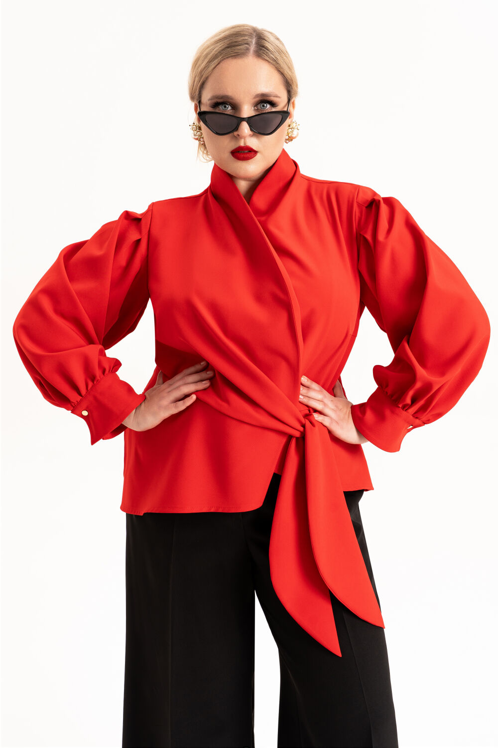 Оригинальная женственная блуза  на запах с вырезом станет незаменимой вещью в Вашем гардеробе. Всесезонная блуза с длинными рукавами на манжетах легко впишется в Ваш повседневный, вечерний, а также деловой офисный стиль. Роскошная блузка сочетает в себе легкость и комфорт. Блуза с отрезной баской  и воротником стойкой переходящей в борта. Застежка на потайную петлю и пуговицу и на завязки. Рукав длинный, втачной на манжете. По окату рукава обработаны складки. Вы сможете носить эту блузу не только летом, но и осенью, зимой и весной. Стильная женская блуза класса люкс соответствует модным тенденциям 2025-26 года. Ткань отлично тянется и обеспечивает идеальную посадку по фигуре. Мы уверены, что высокое качество Вас не разочарует! Широкий размерный ряд, включающий большие размеры, позволит Вам подобрать подходящий размер. Праздничная блузка скроет несовершенства фигуры, выгодно подчеркивая ваши красоту, женственность и индивидуальность. Элегантная и красивая блуза станет идеальным вариантом как для торжественных мероприятий: выпускной, корпоратив, свадьба, любой другой праздник, Новый год, так и для деловых и повседневных встреч, офиса. Нарядная модная блузка отлично подойдет для фотосессии, похода в театр и свидания. Сезоны, когда вы сможете ее носить: осень, зима, весна.