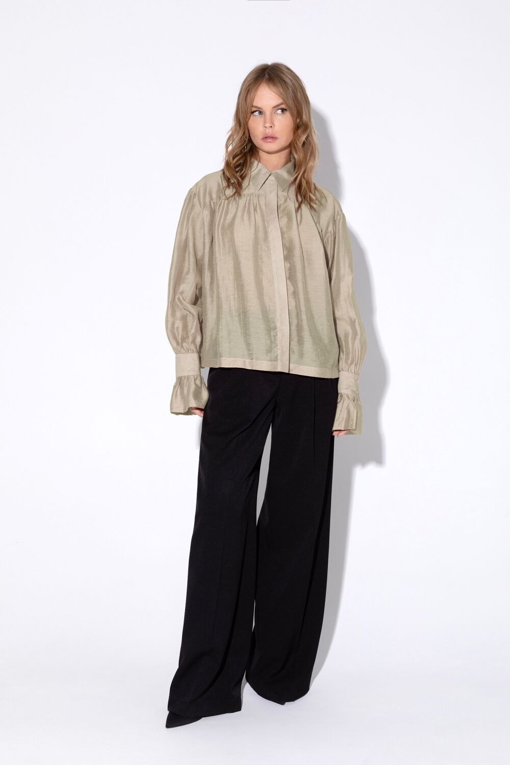 Детали: блуза трапециевидного силуэта и свободного покроя, спущенная линия плеча, кокетки переда и спинки, рубашечный воротник, потайная застежка на петли и пуговицы, рукава втачные длинные с манжетой и оборкой, блуза без подкладки.