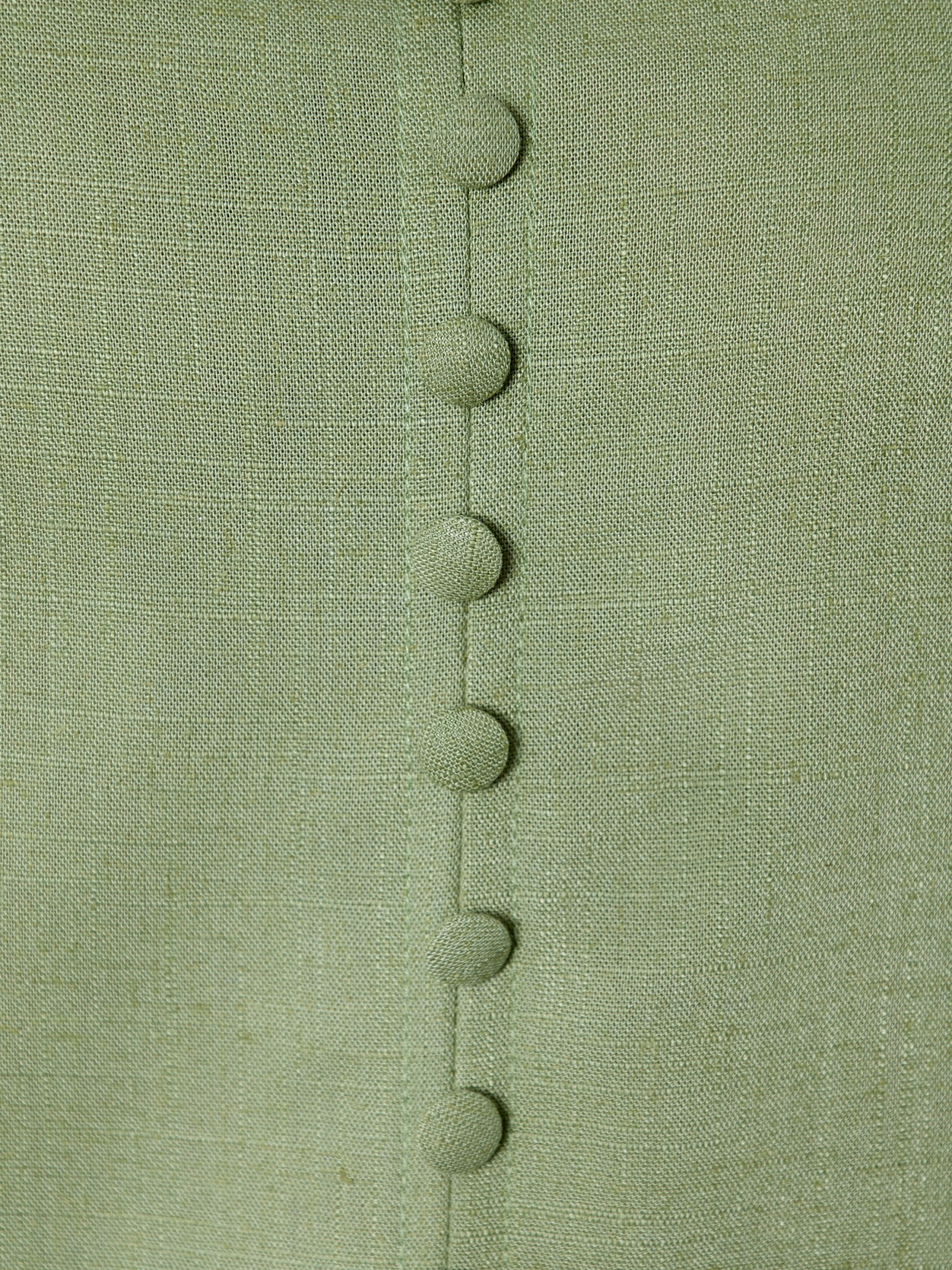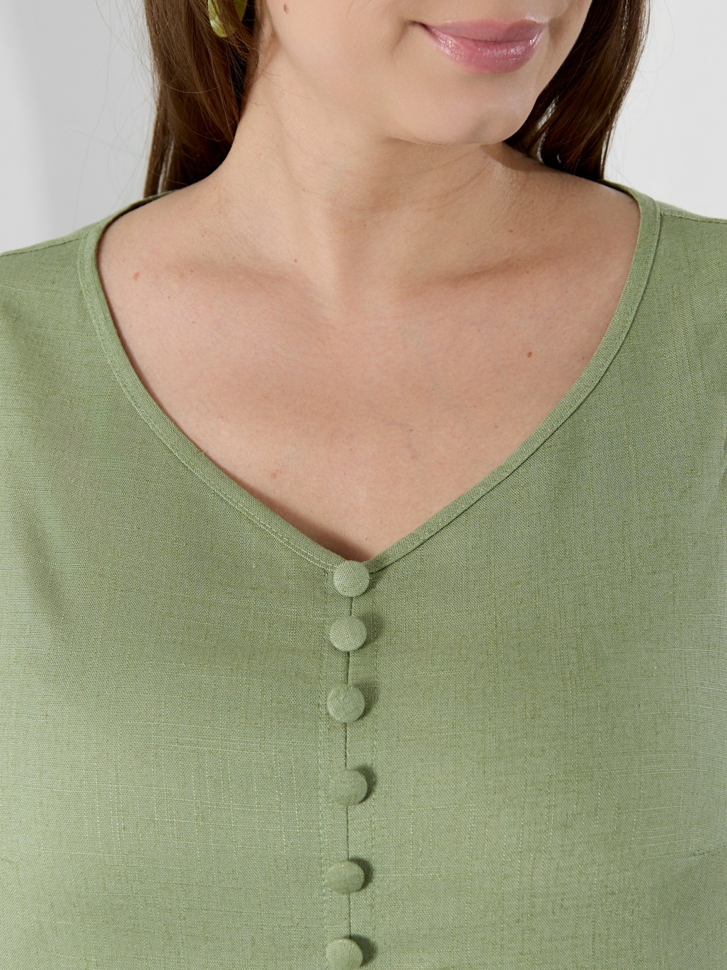 Блузка женская из гладкокрашеного тканого полотна, полуприталенного силуэта, без рукавов, с V-образной горловиной и вытачками в области груди. Перед состоит из двух частей, в шве соединения деталей разрез. От горловины до разреза пришиты декоративные пуговицы имитирующие застежку. Горловина и проймы окантованы основным материалом.