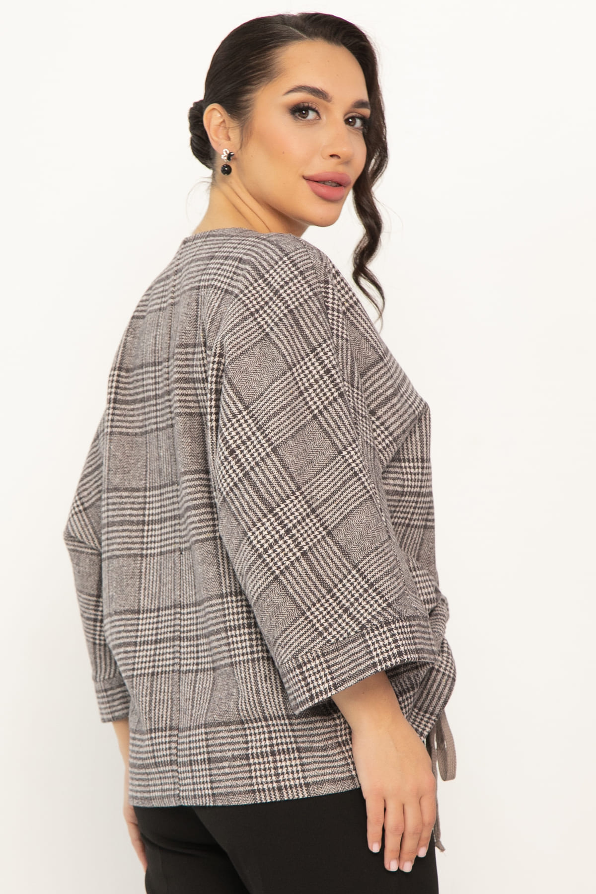 Блузка свободного кроя в клетку — это то, что вам нужно! V-образный вырез подчеркнёт вашу шею, а цельнокроеные рукава с манжетами придадут образу элегантности. Блузка украшена кулиской спереди — это изящная деталь, которая сделает ваш образ неповторимым. Блузка идеально подойдёт для прогулок, встреч с друзьями или уютных вечеров дома. Позвольте себе быть яркой и стильной с нашей оригинальной женской блузкой!