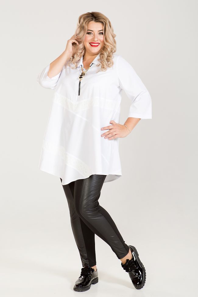 белый Удлиненная стильная рубашка из блузочной ткани длиной за линюю бедра. Втачные рукава 3/4 дают полную свободу движениям. Модель с отложным воротником, по центру на застежки петли пуговицы. Рубашка с элегантными вставками из кружева, что придает нотку романтики. Отличный выбор для делового стиля.