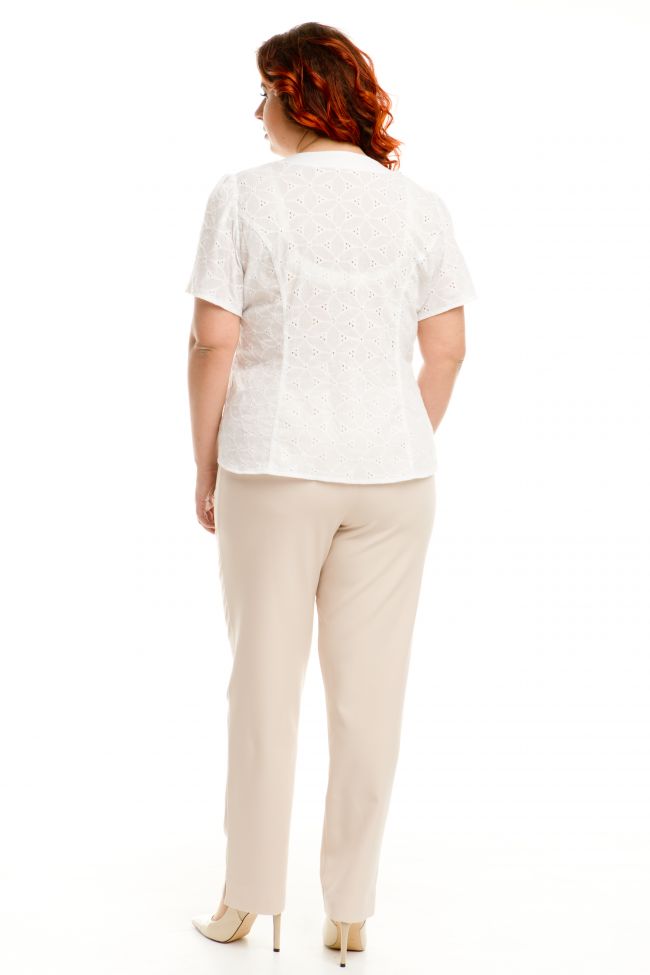 белый Прекрасная блузка полуприлегающего силуэта из тонкого хлопчатобумажного шитья. Горловина оформлена широкой обтачкой из ткани компаньона. Втачные рукава длиной до локтя с небольшой сборкой по окату добавят модели романтичности. По центру полочки выполнена планка из ткани компаньона с застежкой на петли-пуговицы. На спинке - вытачки. Натуральная дышащая ткань позволит сохранить свежесть в жаркие летние будни. Блузка составит комфортный повседневный комплект с юбками или брюками.