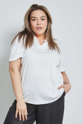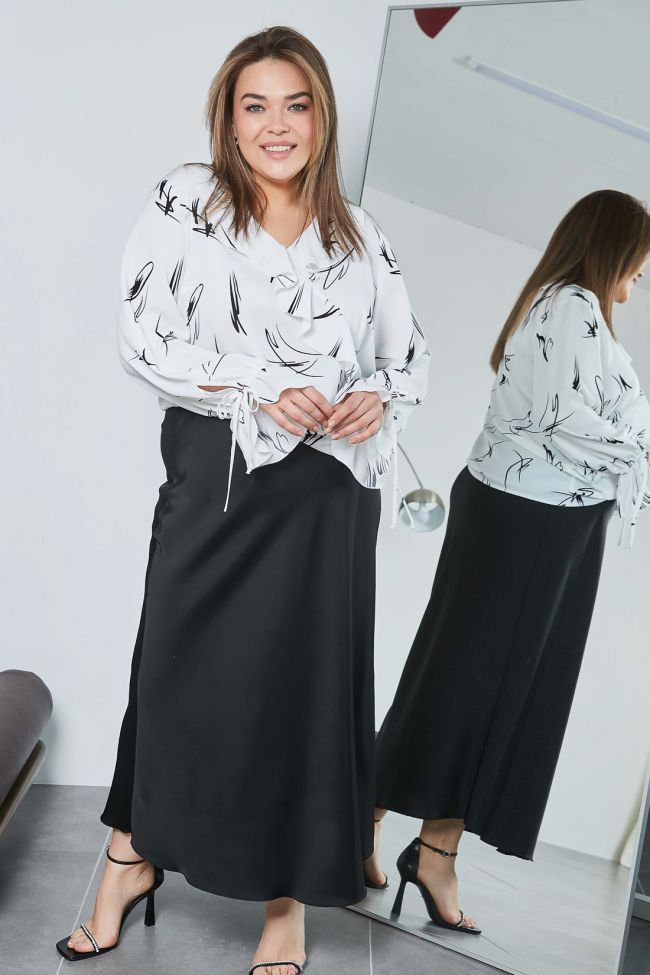 белый Женственная блуза выполнена  из шелковой ткани. По переду прилегание по груди за счет вытачек. V образный вырез горловины дополнен воланом плавно опускающимся к низу. Втачные длинные рукава дополнены оборкой о мягкой завязкой на запястье, оборка как и волан горловины обработан закруткой.Блузка позволит вам выглядеть стильно и женственно в любой ситуации. Она идеально подходит как для торжественных мероприятий, так и для повседневной носки. Блузка больших размеров обеспечит комфорт и уют в любое время года.
