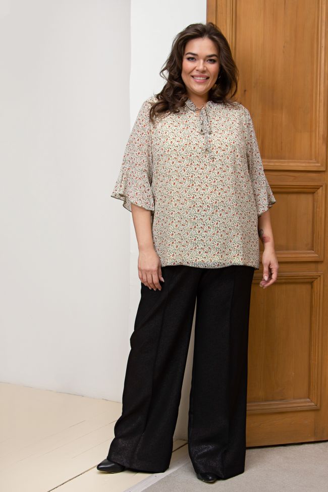 светло-зеленый Шифоновая блузка на подкладке - это не просто предмет гардероба, это настоящий акцент вашего образа! По переду прилегание по груди за счет вытачек. Оригинальный воротник  переходящий в завязки. Втачные рукава длинной 3/4, низ рукава дополнен воланом и обработан закруткой как и низ изделия  Блузка позволит вам выглядеть стильно и женственно в любой ситуации. Она идеально подходит как для офиса, так и для повседневной носки. Блузка больших размеров обеспечит комфорт и уют в любое время года. Блузка представлена с брюками арт:1401