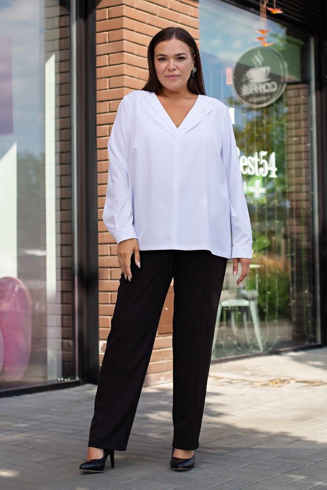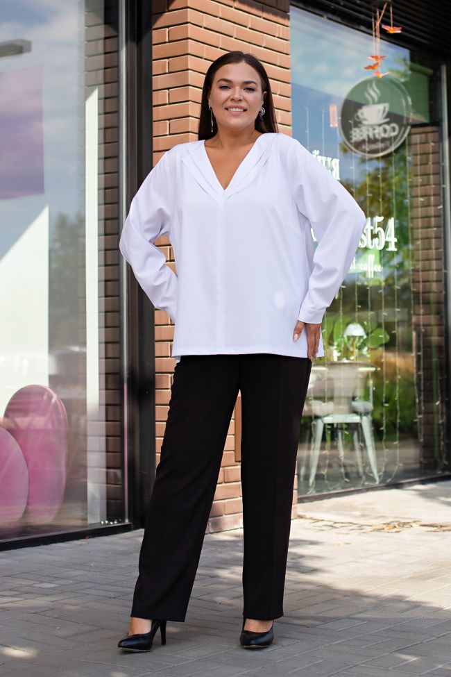 белый Блузка лаконичного кроя из однотонной сорочечной ткани средней длины. Перед со швом по ценру, с V образным вырезом. Воротник отложной, двойной. Блузка со спущенным плечом, рукава втачные полной длины,  с манжетами по низу с застежкой на 1 петлю и пуговицу. Низ  прямой.