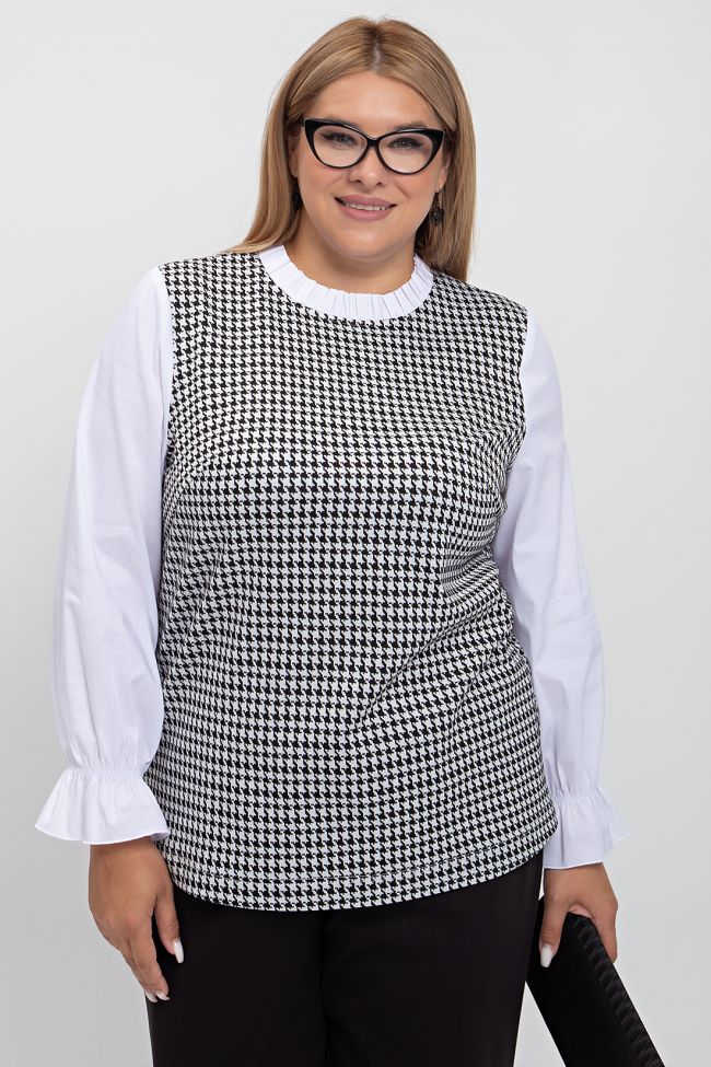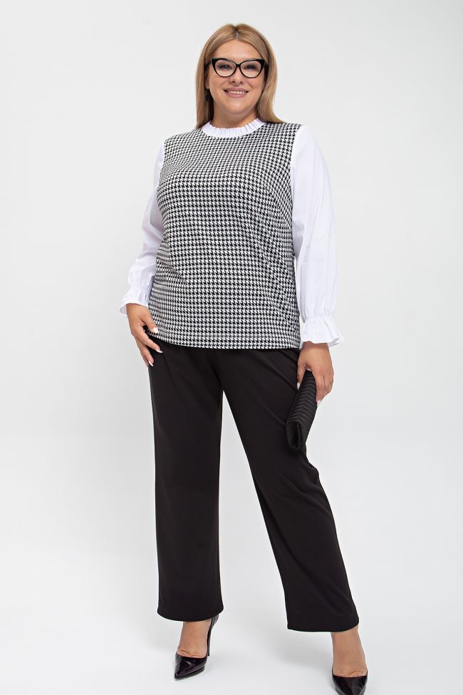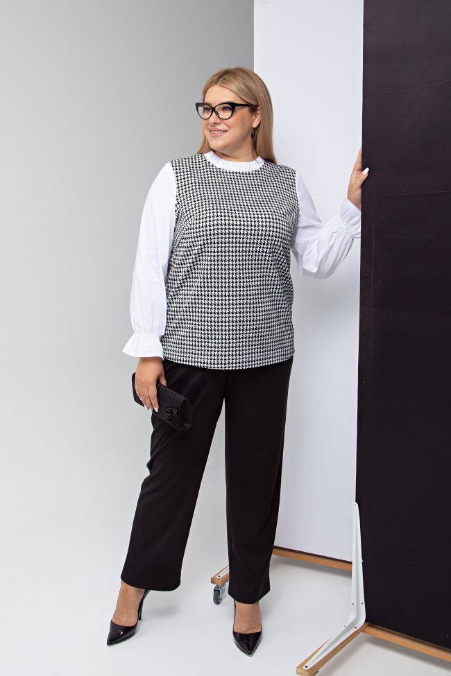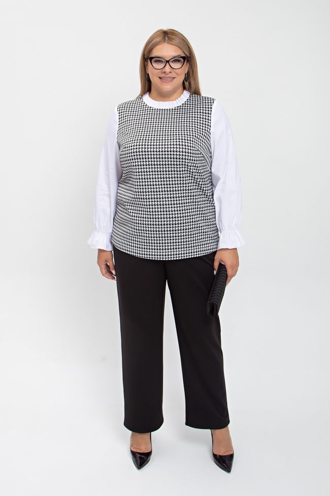 бело-черный Оригинальная блузка с имитацией двойки. Основа – жилет, выполнен из трикотажной ткани, длиной до линии бедер. Прилегание по груди за счет вытачек. По спинке центральный шов с застежкой на петлю и пуговицу. Низ ровный.