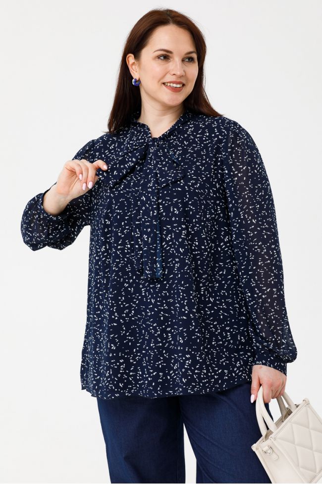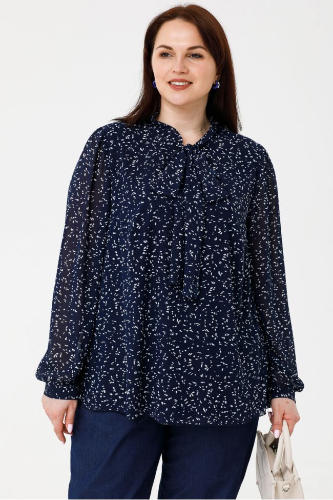 сине-белый Женственная блуза на подкладке, верх - шифон в нежный принт, нижний слой - однотон. По переду прилегание по груди за счет вытачек, по спинке отрезная кокетка, дополнена мелкой сборкой. Оригинальный воротник-стойка, переходящий в бант, создает эффектный акцент. Втачные длинные рукава со сборкой по окату, низ рукава присборен и дополнен манжетой. Манжеты застегиваются на одну петлю и пуговицу. Бант и низ блузки обработаны закруткой.