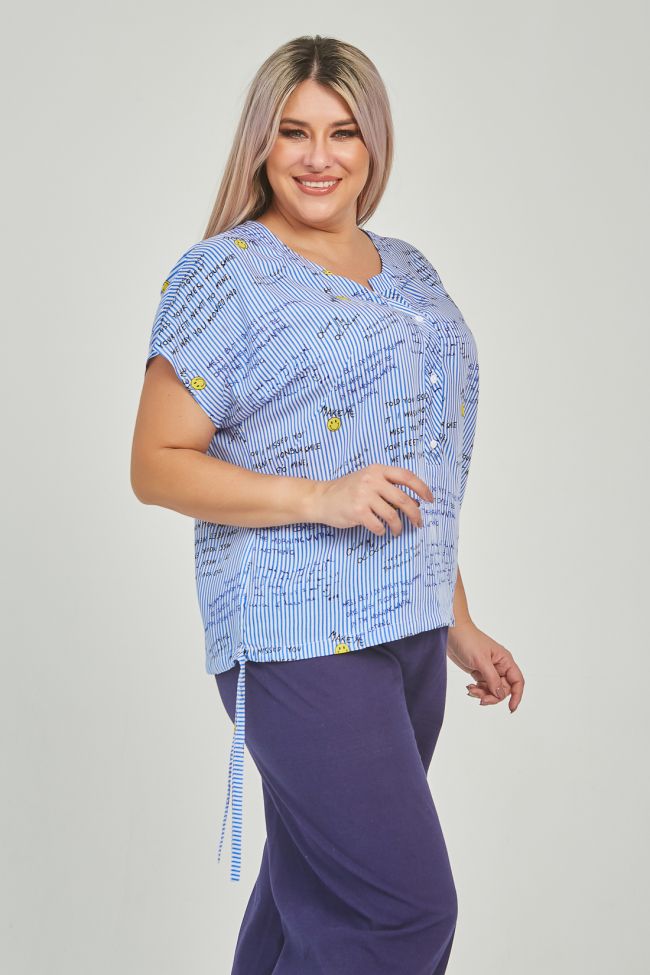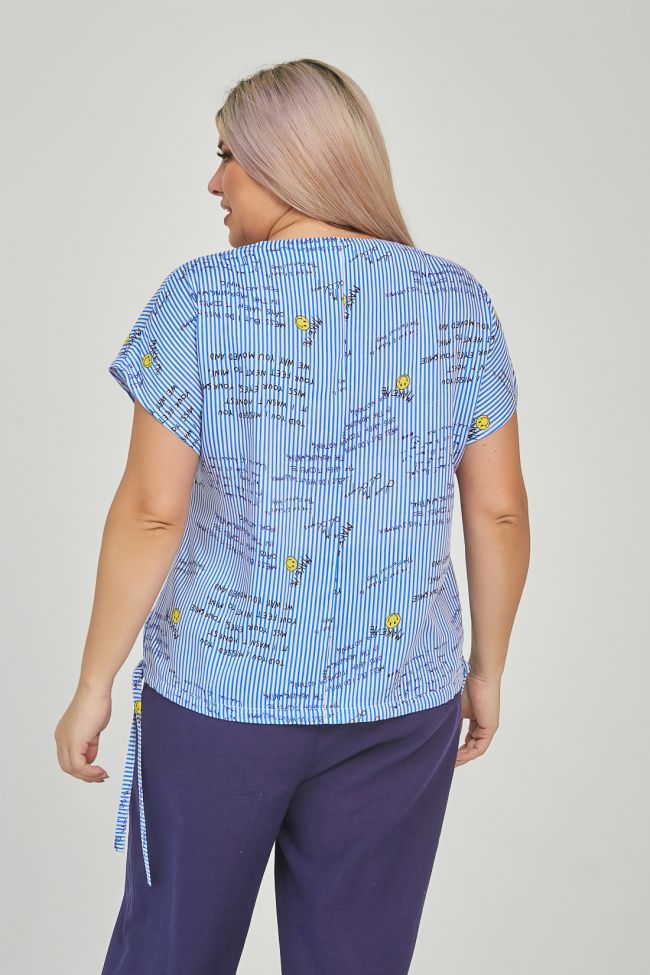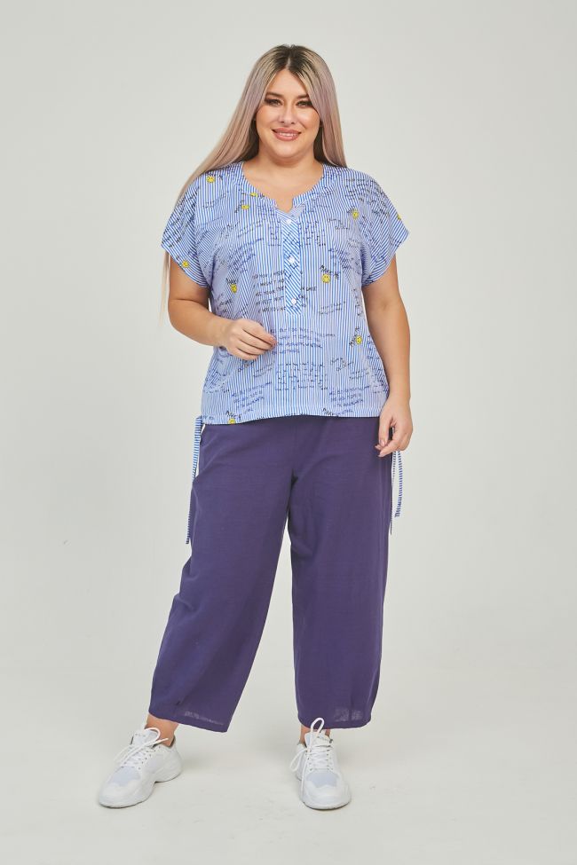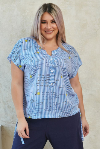 сине-белый Свободная блуза из легкой хлопчатобумажной ткани, длиной до линии бедер. Фигурная горловина оформлена двойной обтачкой. По центру переда - планка до линии талии, с застежкой на петли и пуговицы. Прилегание по груди за счет вытачек. Цельнокроенные рукава. По низу изделия - кулиска.
