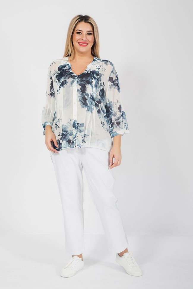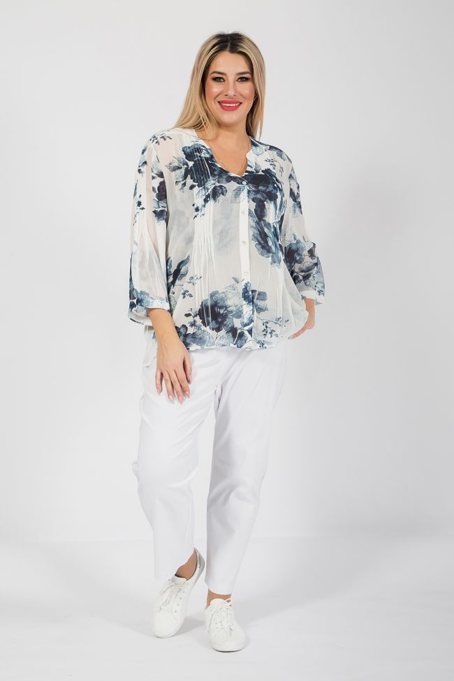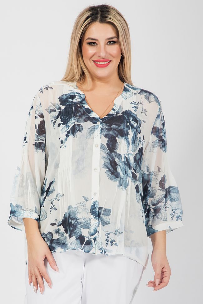 синий Оригинальная блуза прямого силуэта из креш - шифона с нанесенным принтом. Уникальностью модели является нанесение принта на готовое изделие, что позволяет добиться неповторимого эффекта. По переду блузы - планка - поло с застежкой на петли и пуговицы. В виде декоративной отделки по переду и по центру спинки мелкие складки. Спинка с отрезной кокеткой, переходящей на перед. Фигурный вырез горловины оформлен обтачкой. Рукава длиной 7/8, присобраны по нижнему срезу на манжету. Низ ровный, обработан узким швом. Топ в комплект не входит.