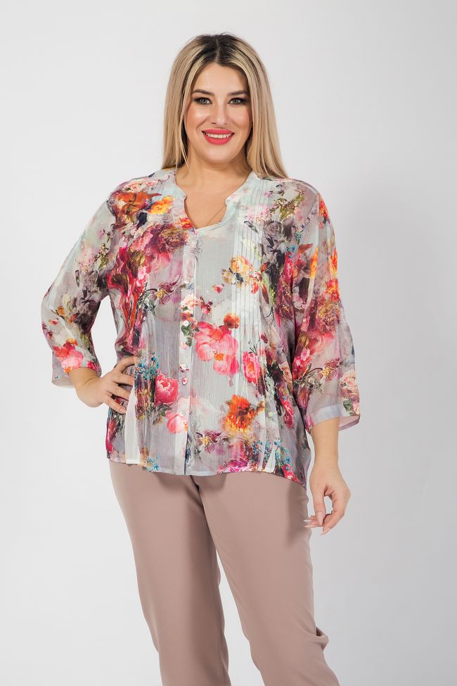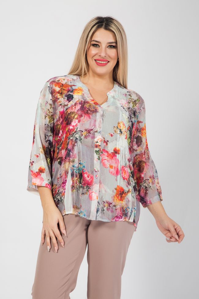 оранжевый Оригинальная блуза прямого силуэта из креш - шифона с нанесенным принтом. Уникальностью модели является нанесение принта на готовое изделие, что позволяет добиться неповторимого эффекта. По переду блузы - планка - поло с застежкой на петли и пуговицы. В виде декоративной отделки по переду и по центру спинки мелкие складки. Спинка с отрезной кокеткой, переходящей на перед. Фигурный вырез горловины оформлен обтачкой. Рукава длиной 7/8, присобраны по нижнему срезу на манжету. Низ ровный, обработан узким швом. Топ в комплект не входит.