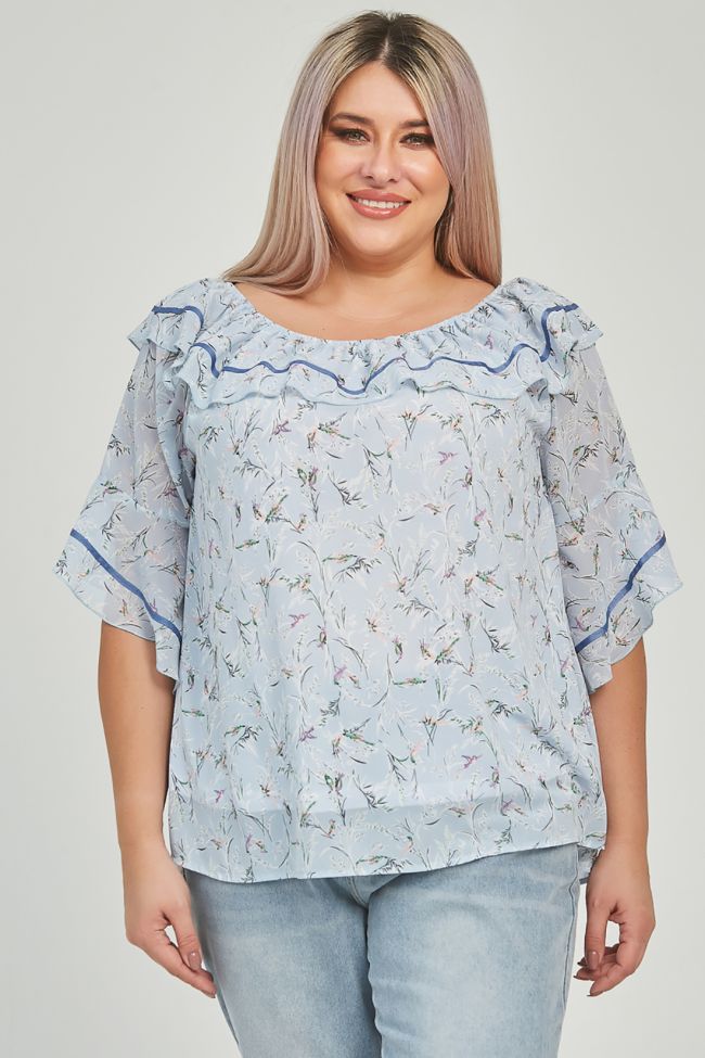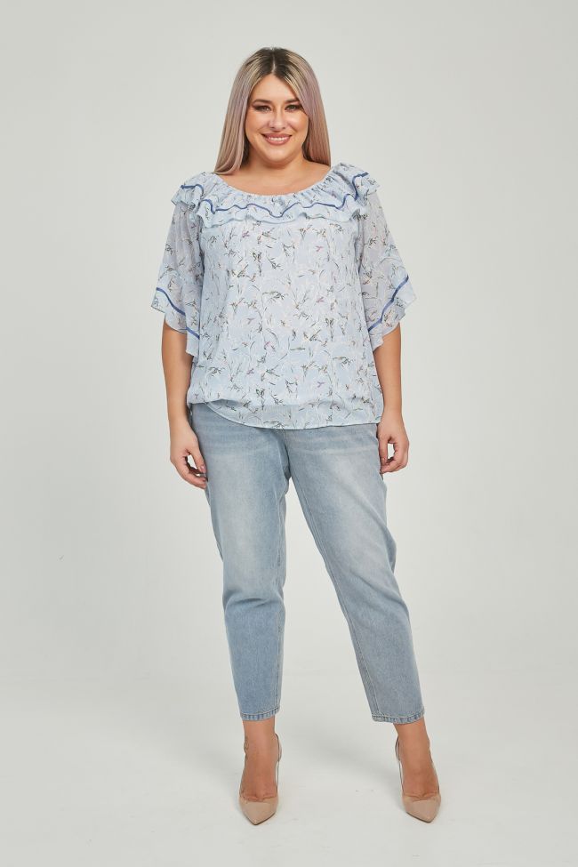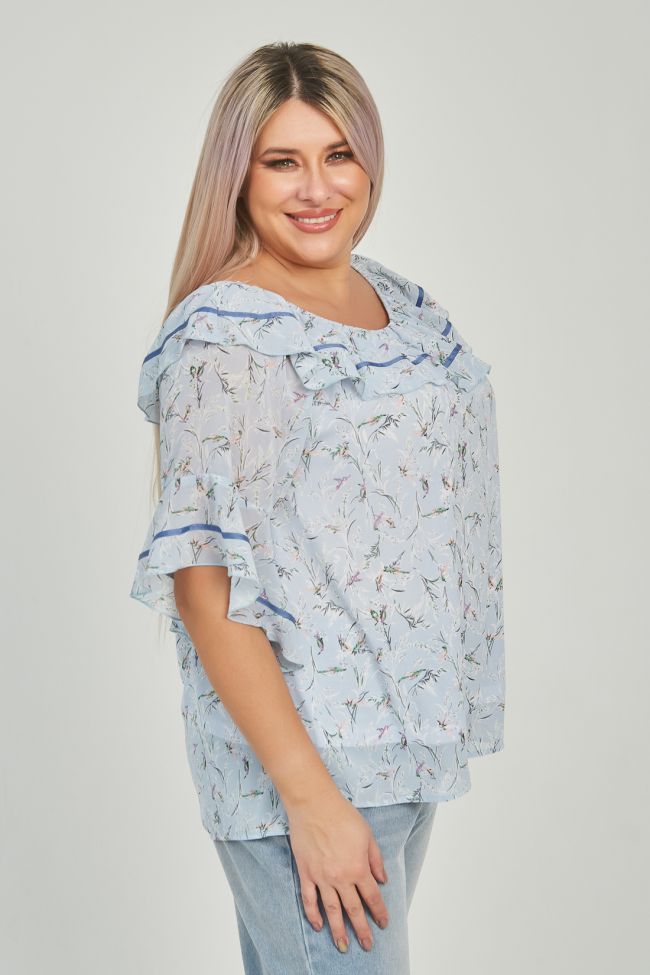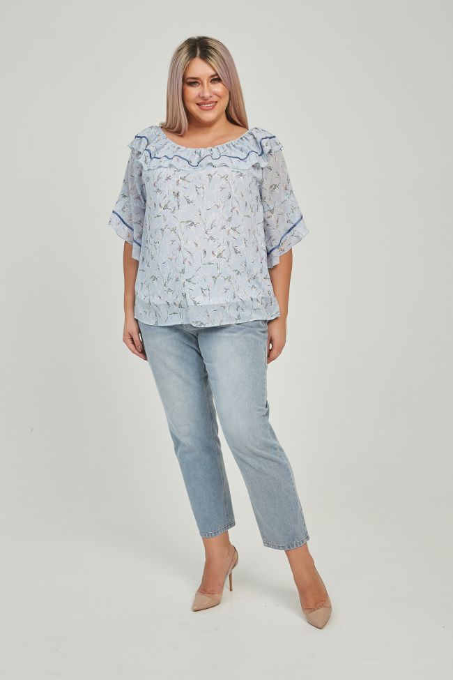 голубой Женственная блуза свободного силуэта длиной до линии бедер. Модель выполнена шифона нежной расцветки, на трикотажной подкладке. Широкий, круглый вырез горловины присобран на резинку и дополнен рюшей. По боковым швам аккуратные разрезы, низ разноуровневый, спинка длиннее переда. Рукава реглан, длиной до уровня локтя оформлены асимметричной рюшей. В качестве отделки по рюше горловины и рукава узкая репсовая тесьма, низ рюши оформлен ролевым швом.