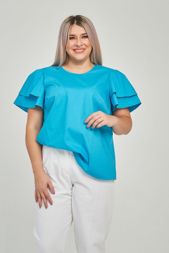 бирюзовый Женственная модель прямого силуэта из блузочной ткани, длиной до линии бедер. Круглый вырез горловины обработан окантовкой. По спинке застежка на петлю и пуговицу. Рукав двойной, укороченный, верхний слой короче нижнего, что придает объёмность рукаву. Сборка по окату рукава создает эффект "фонарика", низ рукавов обработан ролевым швом. Комфортная посадка модели обеспечивается за счет вытачек по груди. Низ изделия ровный. Прекрасный вариант для создания эффектных образов в сочетании с брюками и юбками.