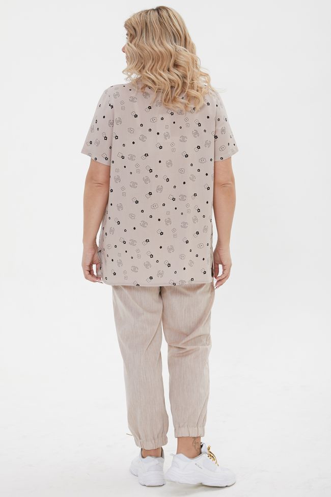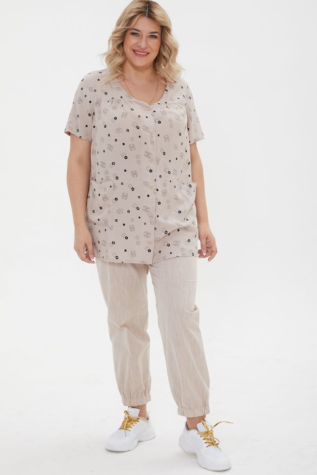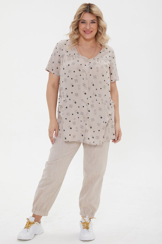 бежевый Блузка прямого силуэта из штапельной ткани с актуальным принтом. По переду - центральная застежка на петли и пуговицы. V- образный вырез горловины. По переду отрезная кокетка над линией груди, снизу дополнена мелкой сборкой. На уровне бедер удобные накладные карманы. Укороченные втачные рукава. Низ ровный, по боковым швам разрезы. Модель составит гармоничный комплект брюкам Арт. 854.