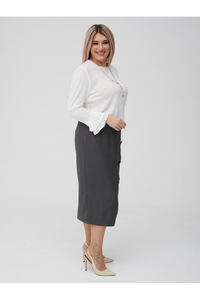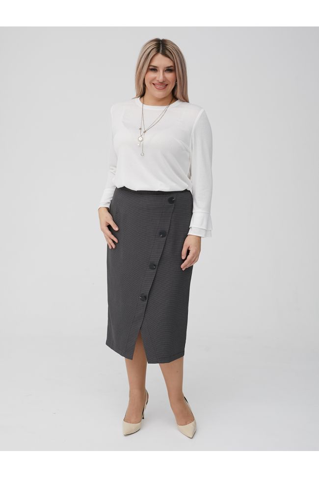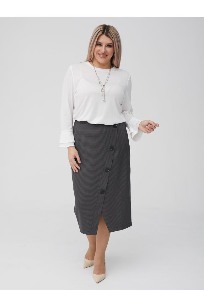 белый Женственная блуза полуприлегающего силуэта из трикотажа с напылением, длиной до линии бедер. Прилегание по груди за счет вытачек. Круглый вырез горловины обработан бейкой. Втачные длинные рукава по низу дополнены двойным воланом. Низ прямой. Прекрасный вариант для создания женственных образов в сочетании с брюками и юбками.
