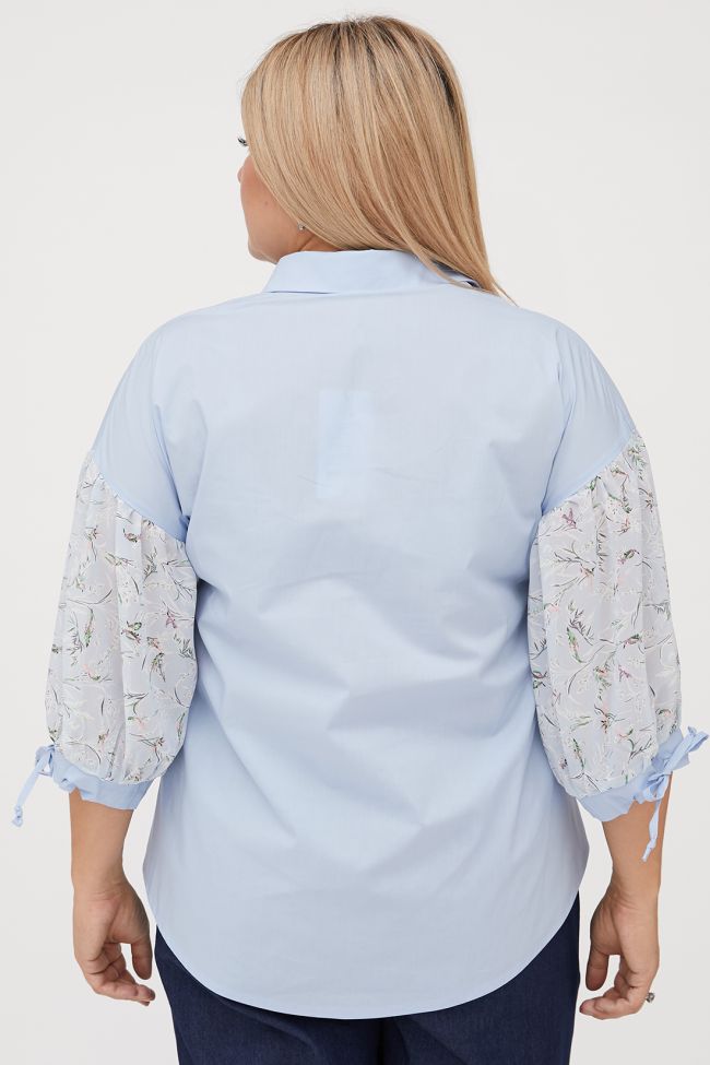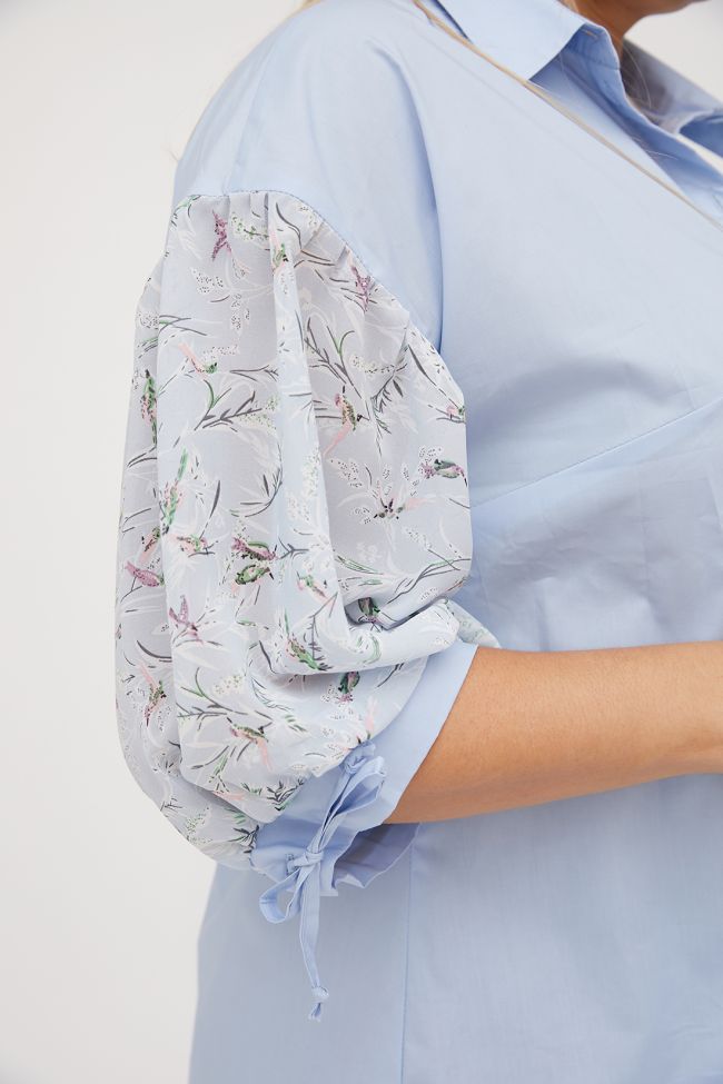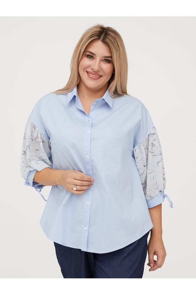 голубой Женственная блузка свободного силуэта из комбинированных тканей нежных оттенков. Основа из хлопковой ткани. Горловина оформлена отложным воротником на притачной стойке. Центральная застежка на петли и пуговицы. Прилегание по груди за счет вытачек. Рукав из шифона в принт, со сборкой по окату на спущенной линии плеча, по низу присобран на манжету с фиксацией на завязки. Низ с актуальным закруглением. Блузка представлена с брюками  арт.1103