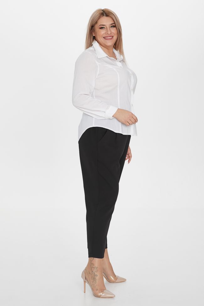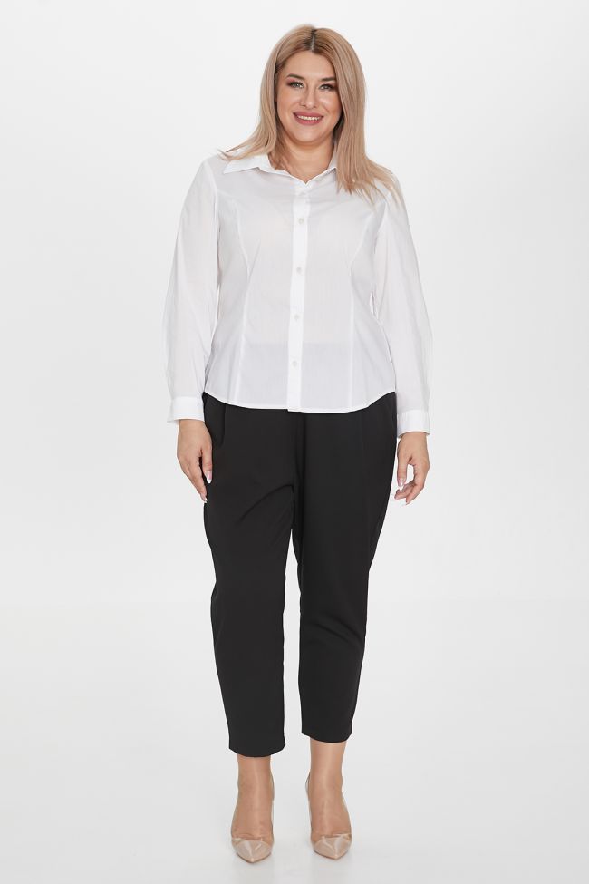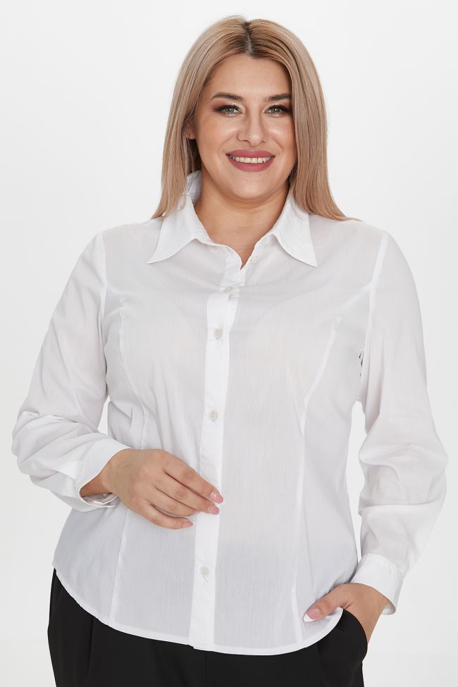 белый Блузка полуприлегающего силуэта из сорочечной ткани, длиной до линии бедра. Прилегание по фигуре достигнуто за счет рельефов переда и спинки. Горловина оформлена отложным воротником на притачной стойке. Перед с центральной застежкой на петли и пуговицы. Втачные длинные рукава по низу дополнены манжетами с застежкой на петли и пуговицы. Низ фигурный.