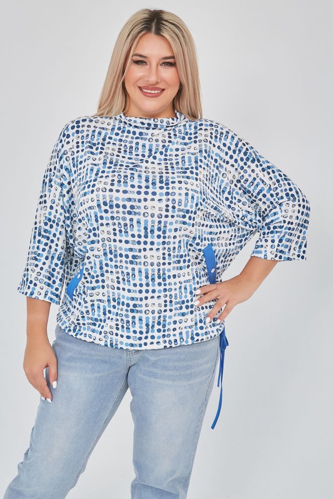 синий Стильная блуза свободного силуэта длиной до линии бедер. Модель выполнена из вискозного трикотажа в яркий принт. Круглый вырез горловины оформлен воротником "хомут". Цельнокроеные рукава длиной 3/4. Спинка разрезная. В качестве отделки по переду наклонные листочки с пуговицей – выполнены из однотонного трикотажа. Низ изделия дополнен кулиской. Модель можно комбинировать с однотонными брюками или джинсами. Отличный вариант в тренде нынешних дней.