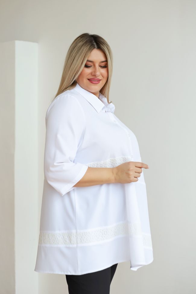 белый Удлиненная стильная блузка из блузочной ткани длиной за линюю бедра. Втачные рукава 3/4 дают полную свободу движениям. Модель с отложным воротником, по центру на застежки петли пуговицы. Блуза с элегантными вставками из кружева, что придает нотку романтики. Отличный выбор для делового стиля.