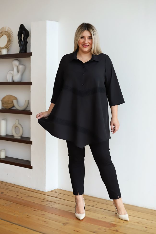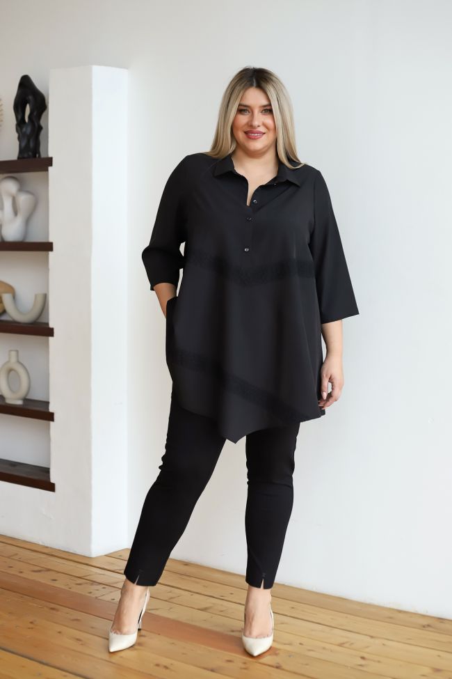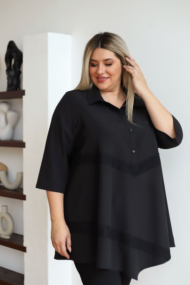 черный Удлиненная стильная блузка из блузочной ткани длиной за линюю бедра. Втачные рукава 3/4 дают полную свободу движениям. Модель с отложным воротником, по центру на застежки петли пуговицы. Блуза с элегантными вставками из кружева, что придает нотку романтики. Отличный выбор для делового стиля.