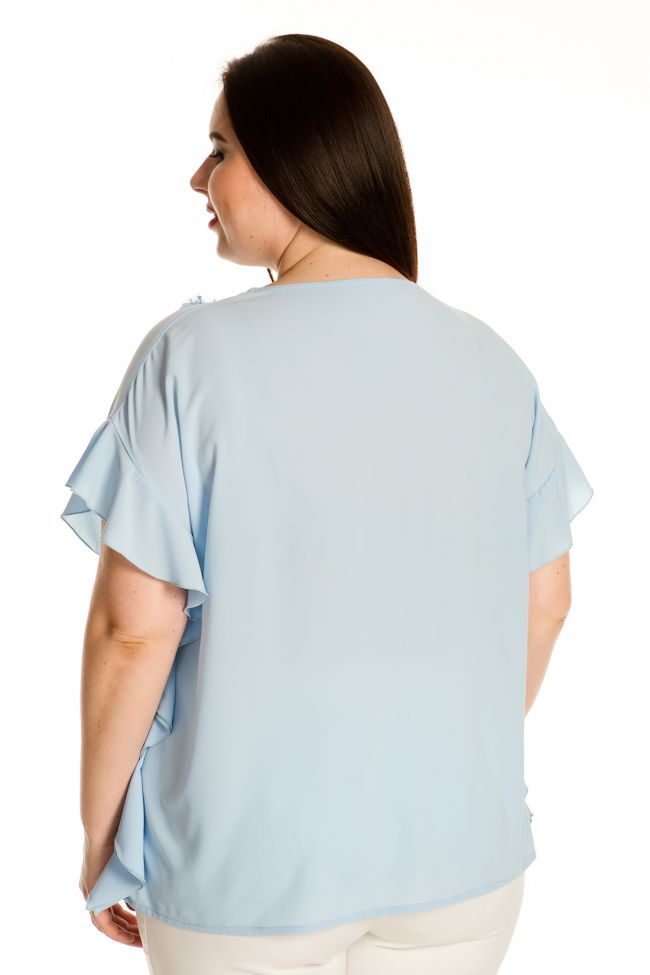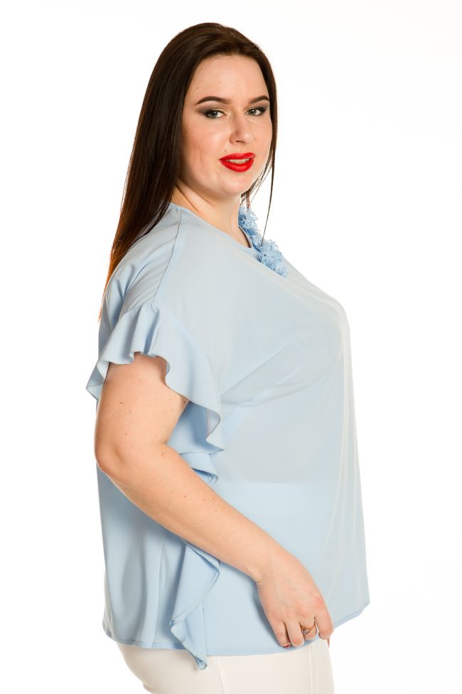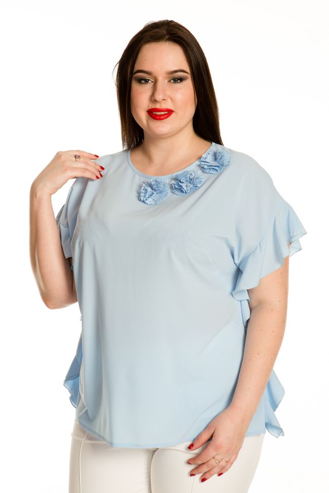 голубой Женственная блузка прямого силуэта из блузочной ткани «шанхай-стрейч». Укороченный цельнокроеный рукав оканчивается воланами, переходящими в боковой шов и струящимися по всей длине изделия. Неглубокий круглый вырез горловины с окантовкой. Комфортная посадка модели обеспечивается за счет вытачек на груди из бокового шва. Изюминка модели – украшение на груди из гипюра в виде роз. Прекрасный вариант для создания эффектных образов в сочетании с брюками и юбками.