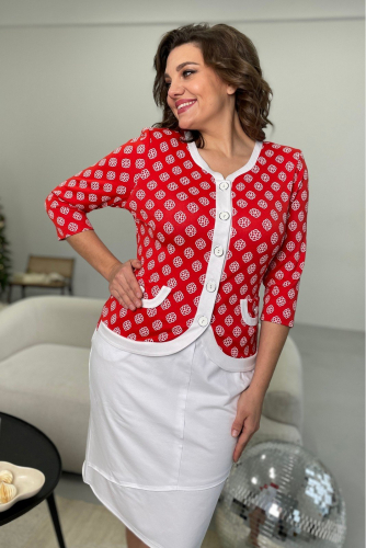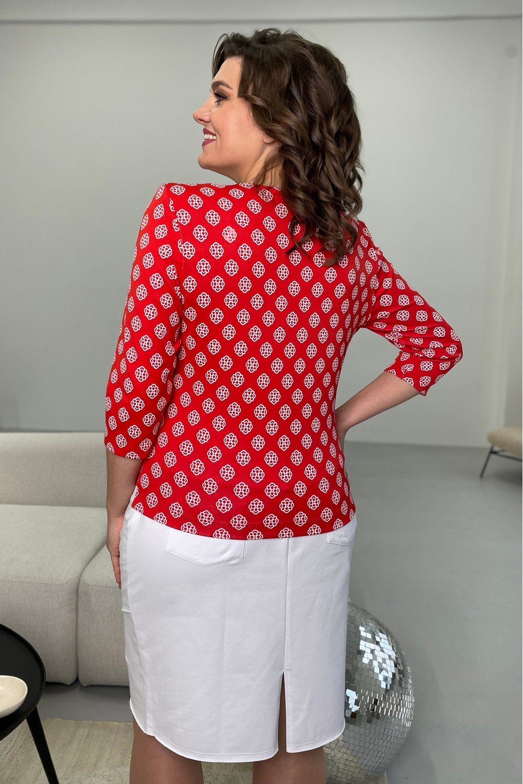Блуза женская, полуприлегающего силуэта из трикотажной ткани. По переду блузки расположены настрочные клапаны, зафиксированные пуговицей. Спинка прямая . Рукав прямой втачной 3/4. Перед оформлен застежкой на петли пуговицы. Длина по спинке 56 ±1 см. Длина рукава 58 ± 1 см.