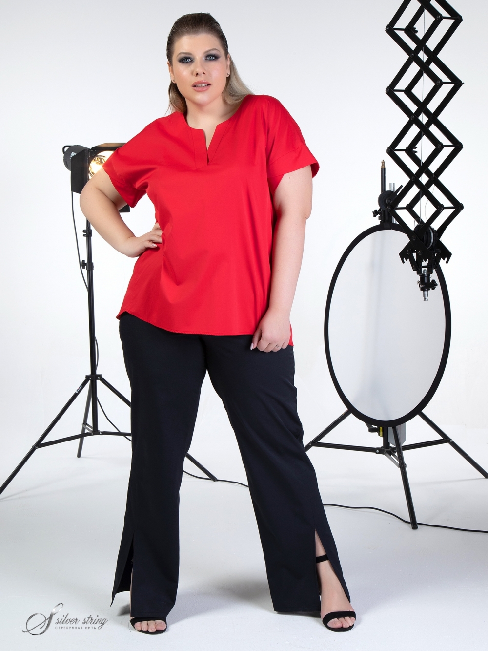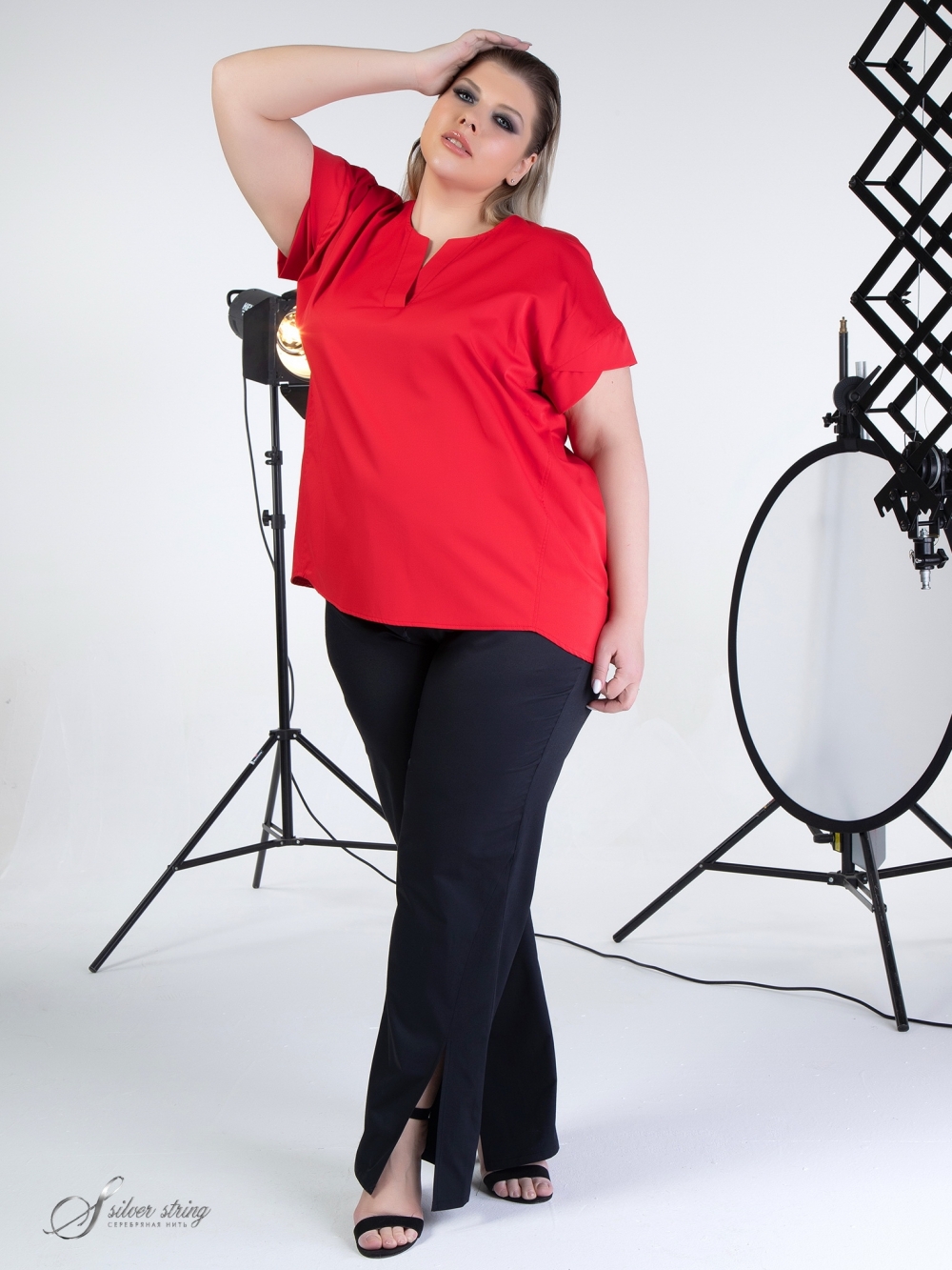 Летняя блуза Т-образного силуэта выполнена из высококачественной гладкокрашеной ткани с высоким содержанием хлопка. Модель с цельнокроеным рукавом длиной до локтя. Низ рукава оформлен притачной планкой, с заходящими « внахлест» краями. Боковые швы нарочито смещены к переду. Линия горловины округлой формы с V-образным вырезом по центру. Вырез оформлен перекрещенными планками. Это комфортная модель в городском стиле, которая прекрасно впишется в Ваш гардероб.