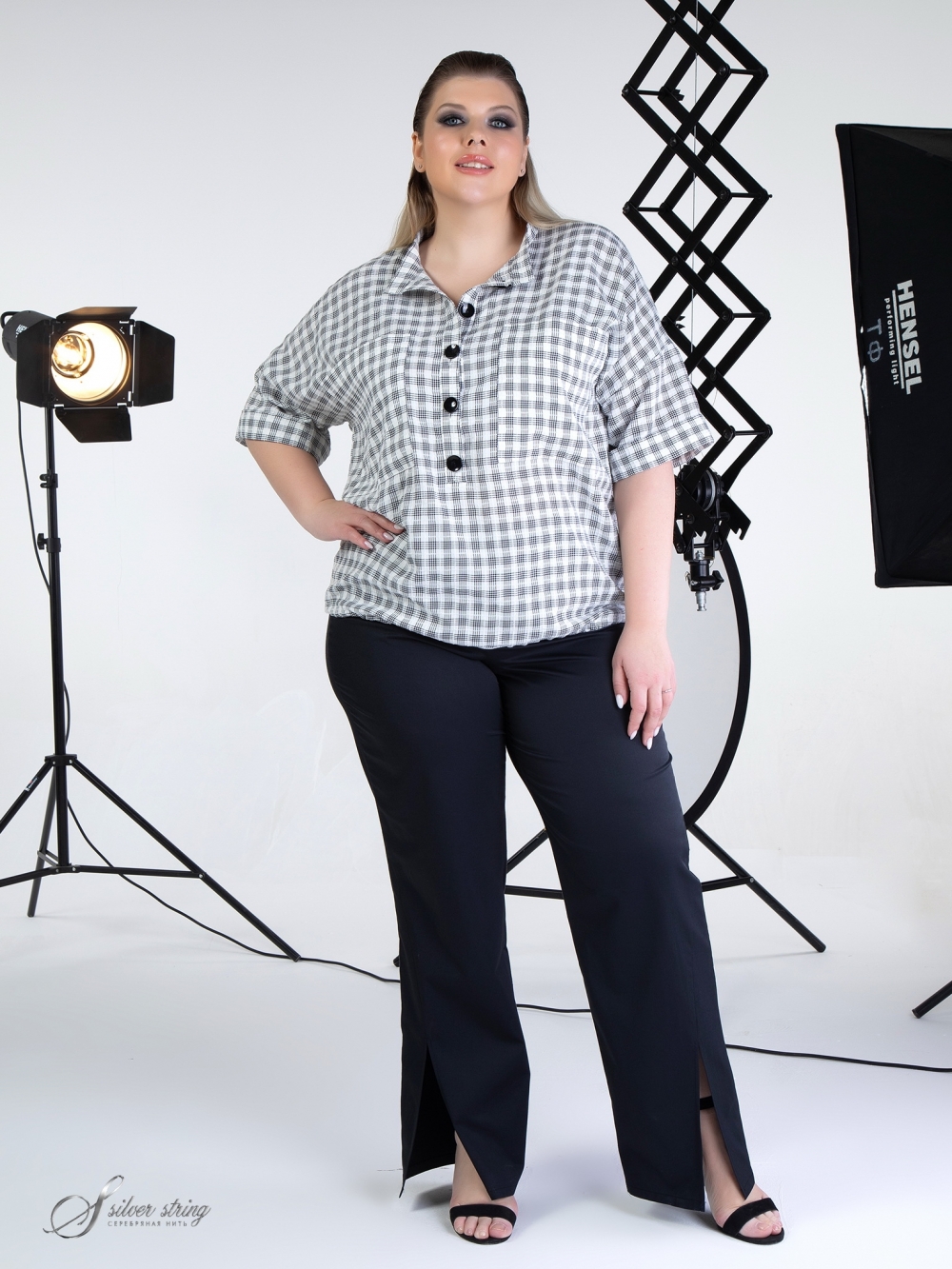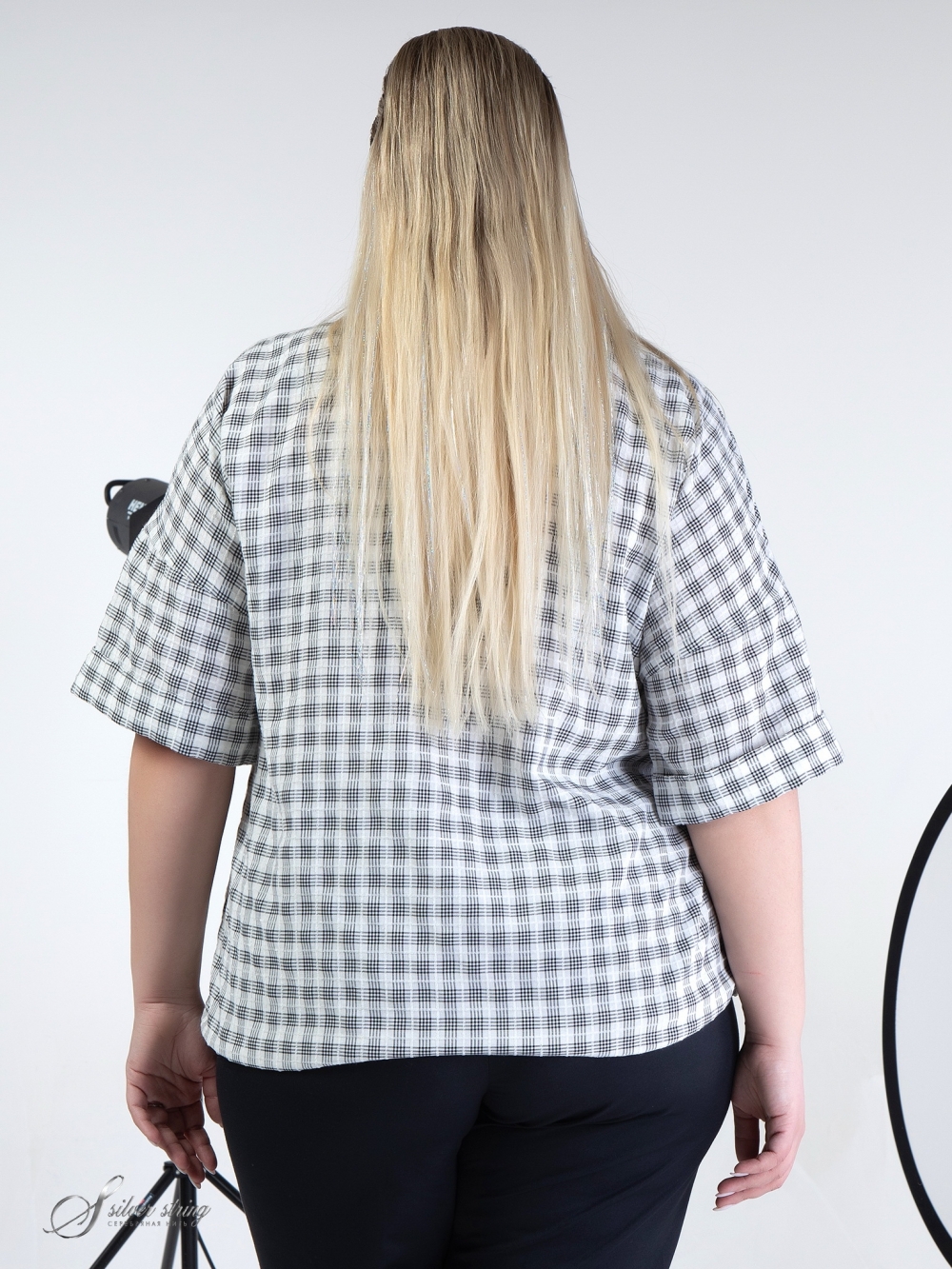 Молодежный блузон Т-образного силуэта, выполнен из смесовой ткани с рисунком в клетку. Модель с удлиненной линией плеча и рукавом длиной за локоть. Низ рукава оформлен отворотом. Воротник-стойка. На полочке обработана застежка-поло на контрастные пуговицы. По низу изделия проложена тонкая эластичная тесьма с фиксаторами, с помощью которых можно моделировать степень прилегания блузы по своему усмотрению. Это комфортная модель в спортивном стиле, которая прекрасно впишется в Ваш гардероб.