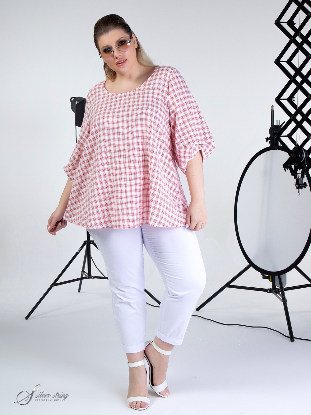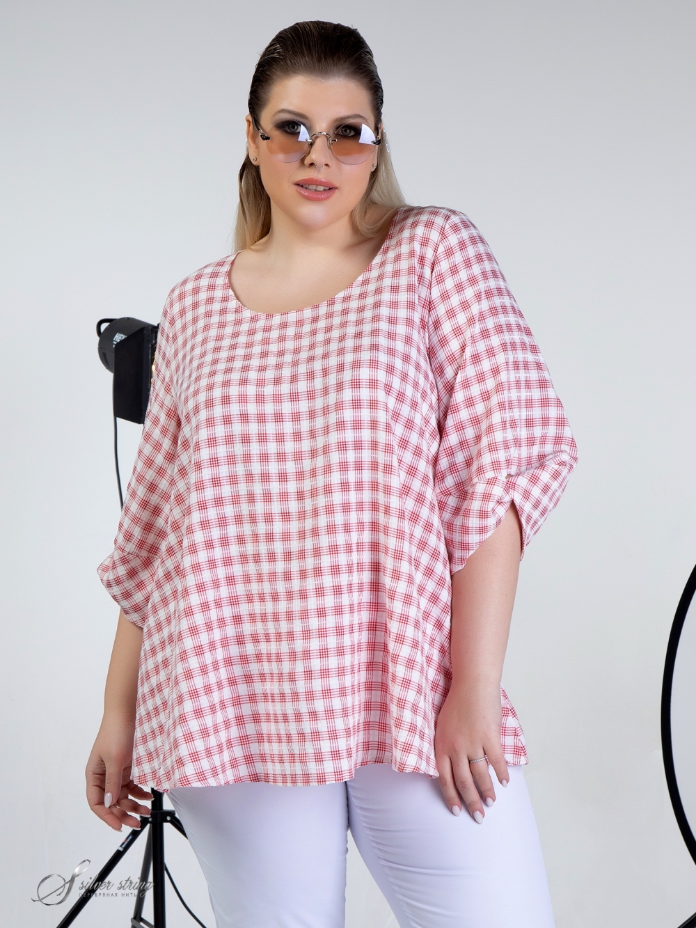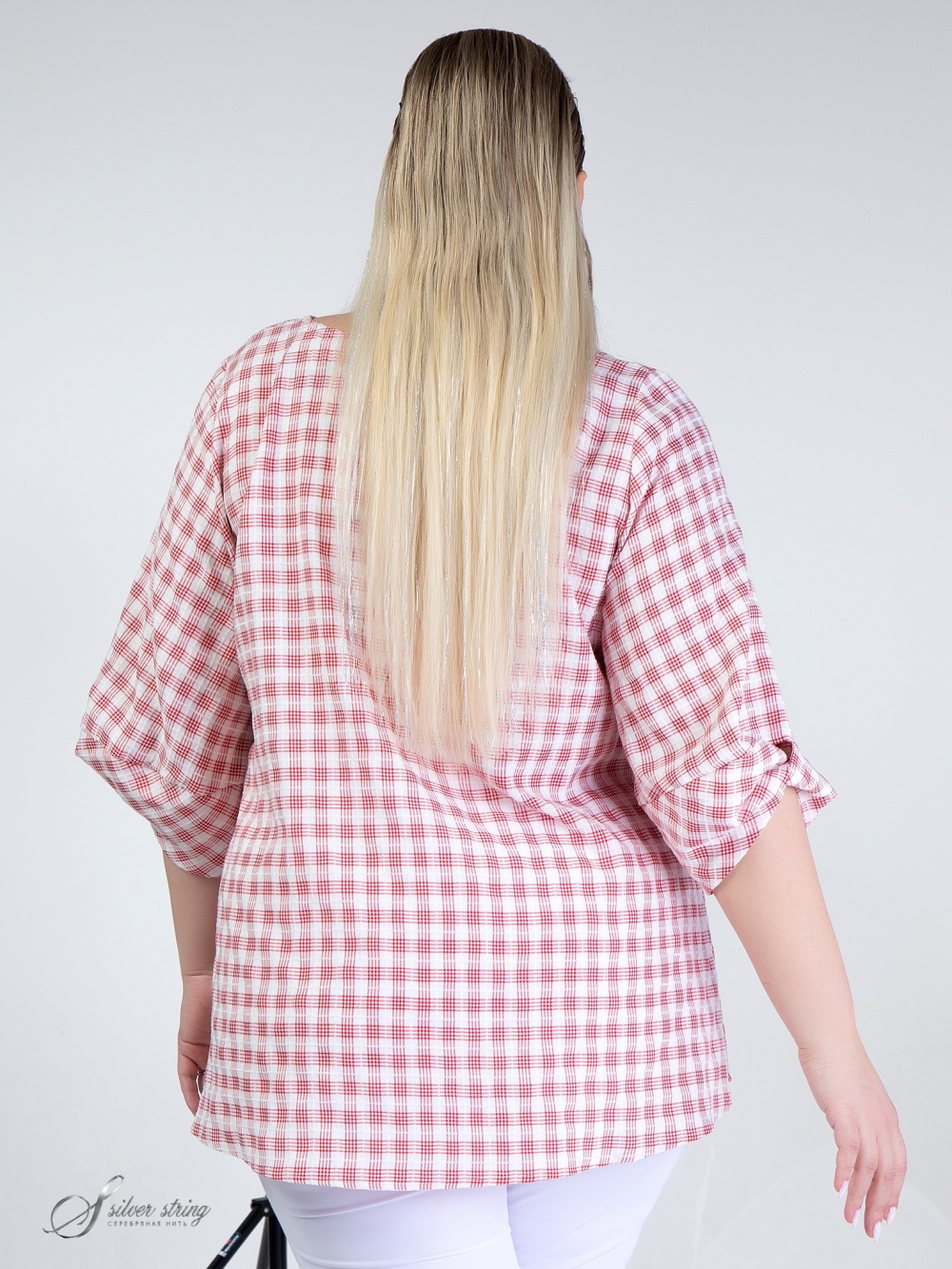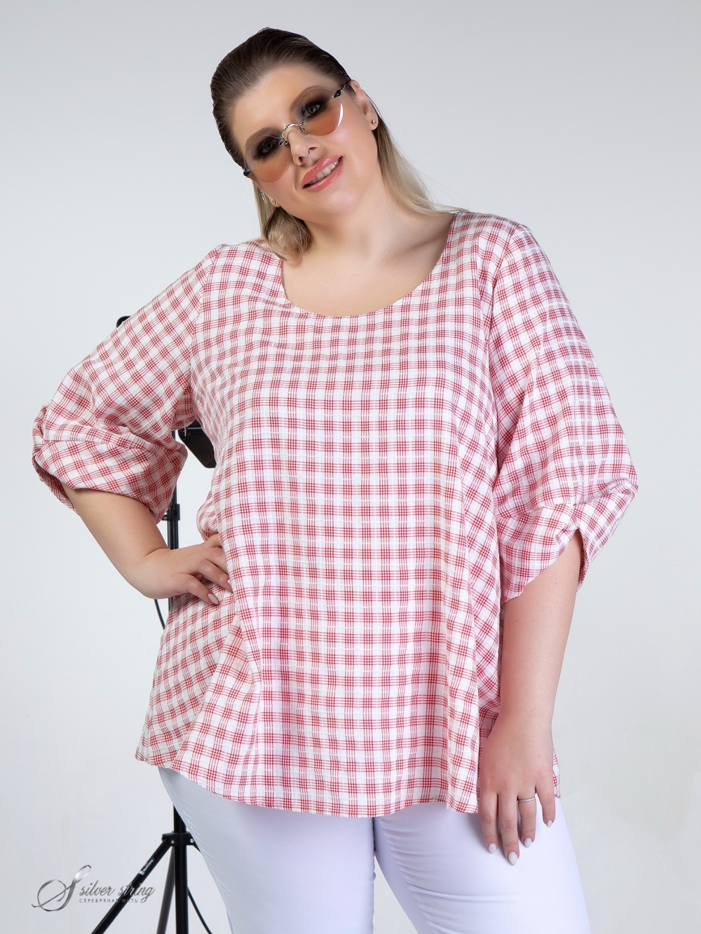 Элегантная блуза-туника свободного силуэта выполнена из натуральной ткани с рисунком в клетку. Ткань обладает легким «крэш» - эффектом. Модель с втачным объемным рукавом, длиной 3/4. Нижняя часть рукава оригинально оформлена за счёт отрезной перекрученной детали. Линия горловины округлой формы. Это модная и оригинальная модель, которая выполнена с учетом особенностей фигуры полных дам и позволяет подчеркнуть их шарм и индивидуальность.