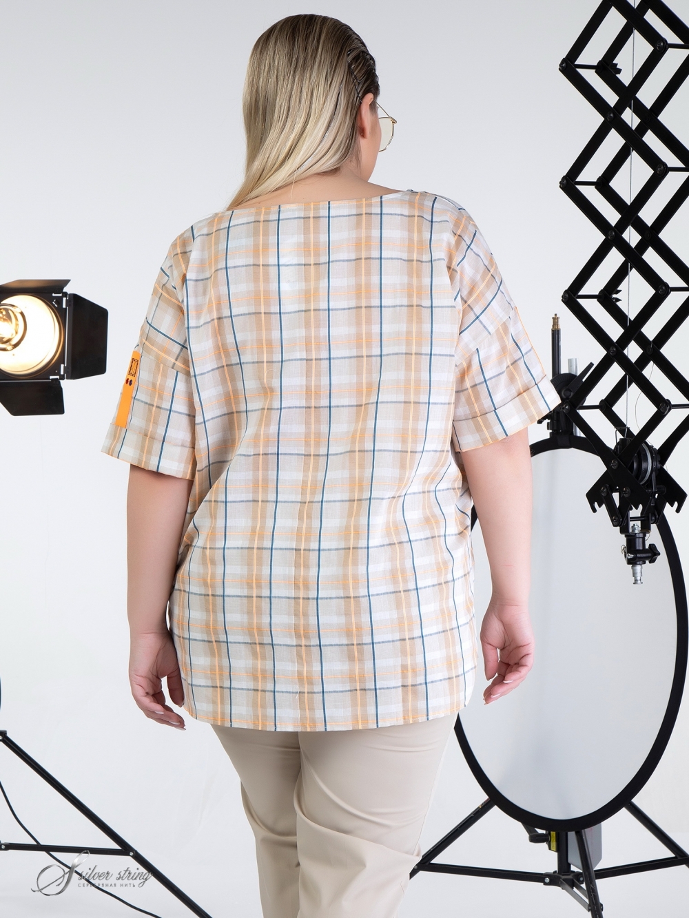 Современная блуза Т-образного силуэта выполнена из хлопковой ткани с рисунком в клетку. Ткань обладает легким «крэш» - эффектом. Модель с удлиненной линией плеча и коротким просторным рукавом. Низ рукава оформлен отворотом. Яркие декоративные элементы настрочены на рукав вдоль линии плеча. Линия горловины округлой формы. В боковых швах обработаны скругленные разрезы. В модели органично сочетаются современные материалы с лаконичным кроем.