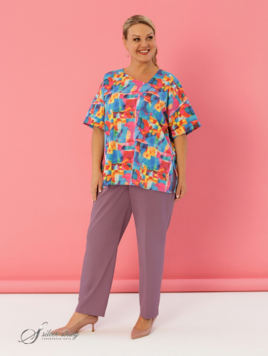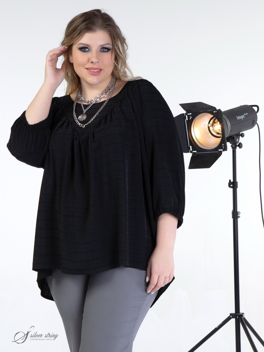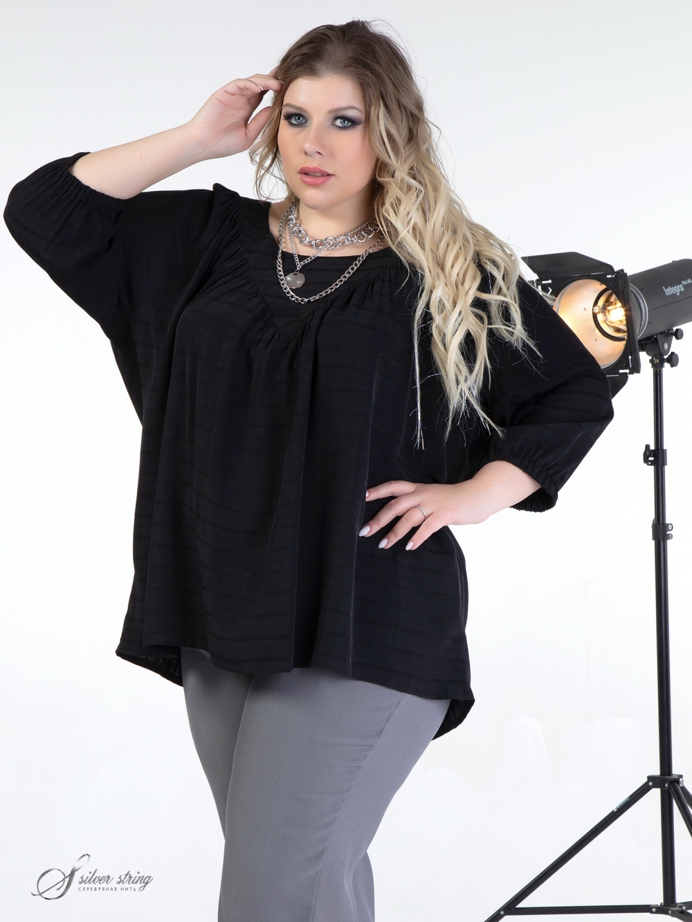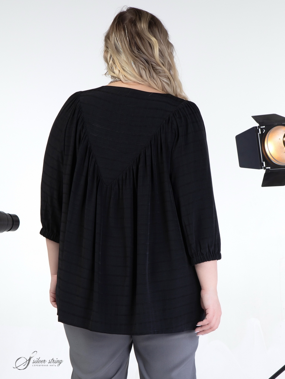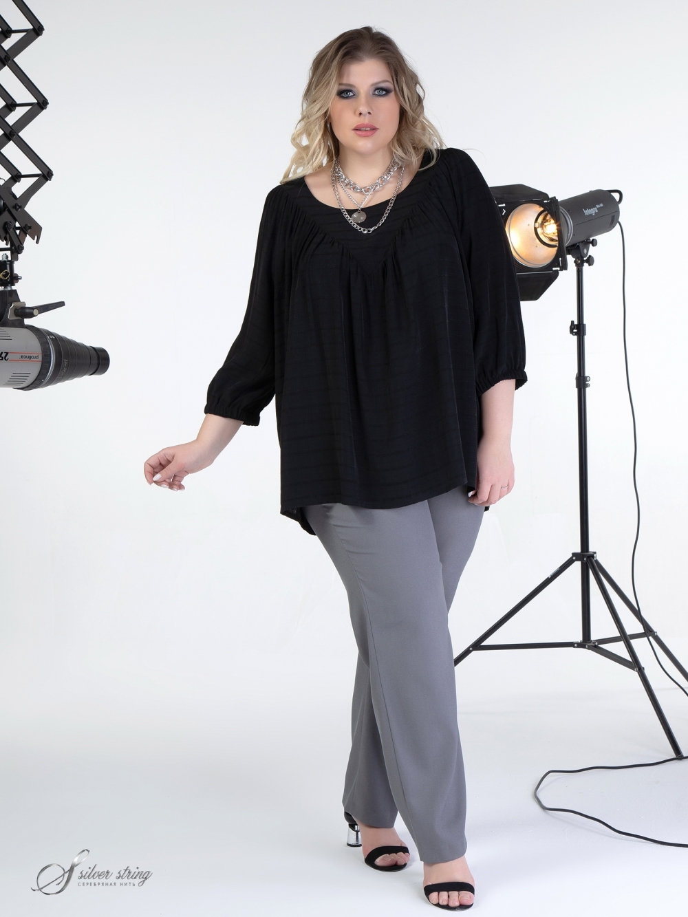 Элегантная блуза свободного силуэта, выполнена из ткани с высоким содержанием натурального волокна. На гладкокрашеном полотне просматривается выработка в клетку. Модель с объемным рукавом длиной 3/4. Низ рукава присобран на эластичную тесьму. Горловина округлой формы, расширена к плечам. На полочке и спинке обработаны глубокие кокетки треугольной формы. Вдоль линий кокеток проходит густая сборка. Такой крой модели отлично скрывает проблемные зоны и прекрасно комплектуется с зауженными брюками.
