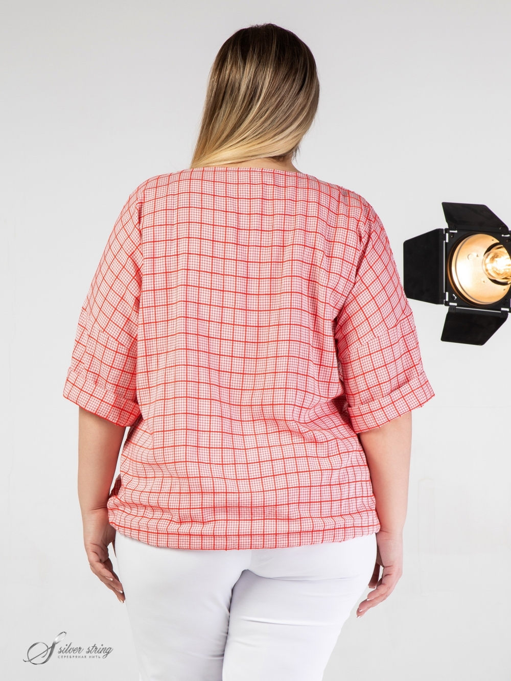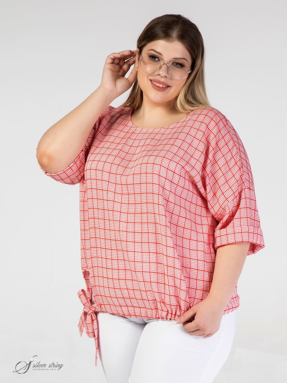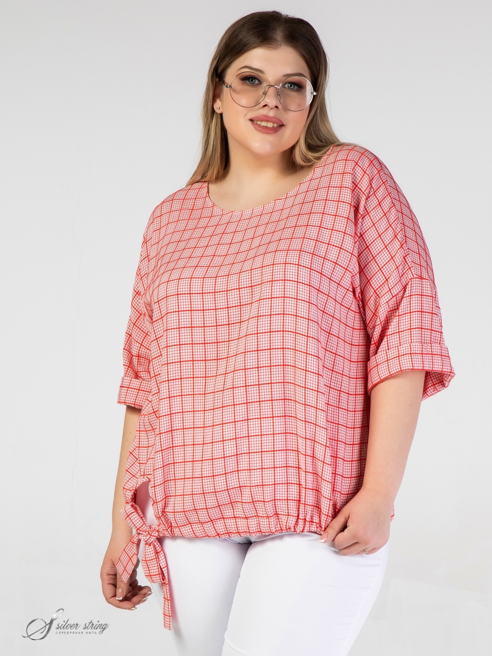 Молодежный блузон Т-образного силуэта, выполнен из смесовой ткани с рисунком в клетку. Модель с удлиненной линией плеча и рукавом длиной за локоть. Линия горловины округлой формы, слегка расширена к плечам. Из подгибки низа сформирована широкая кулиса, сквозь которую проходит пояс, с помощью которого можно моделировать степень прилегания и объем блузы. Модель позволит чувствовать себя элегантно и свободно при любых обстоятельствах.