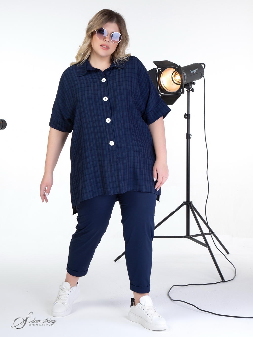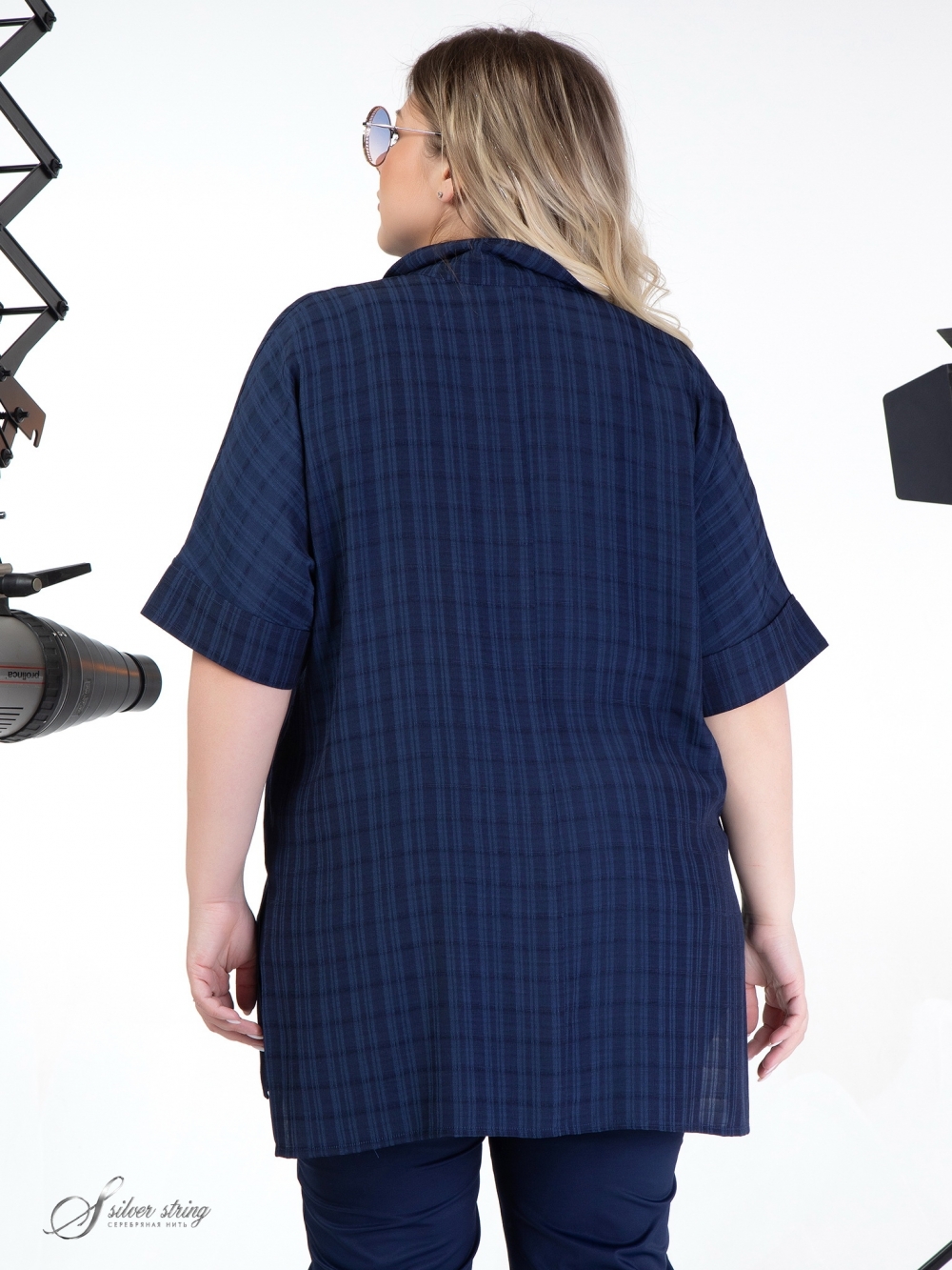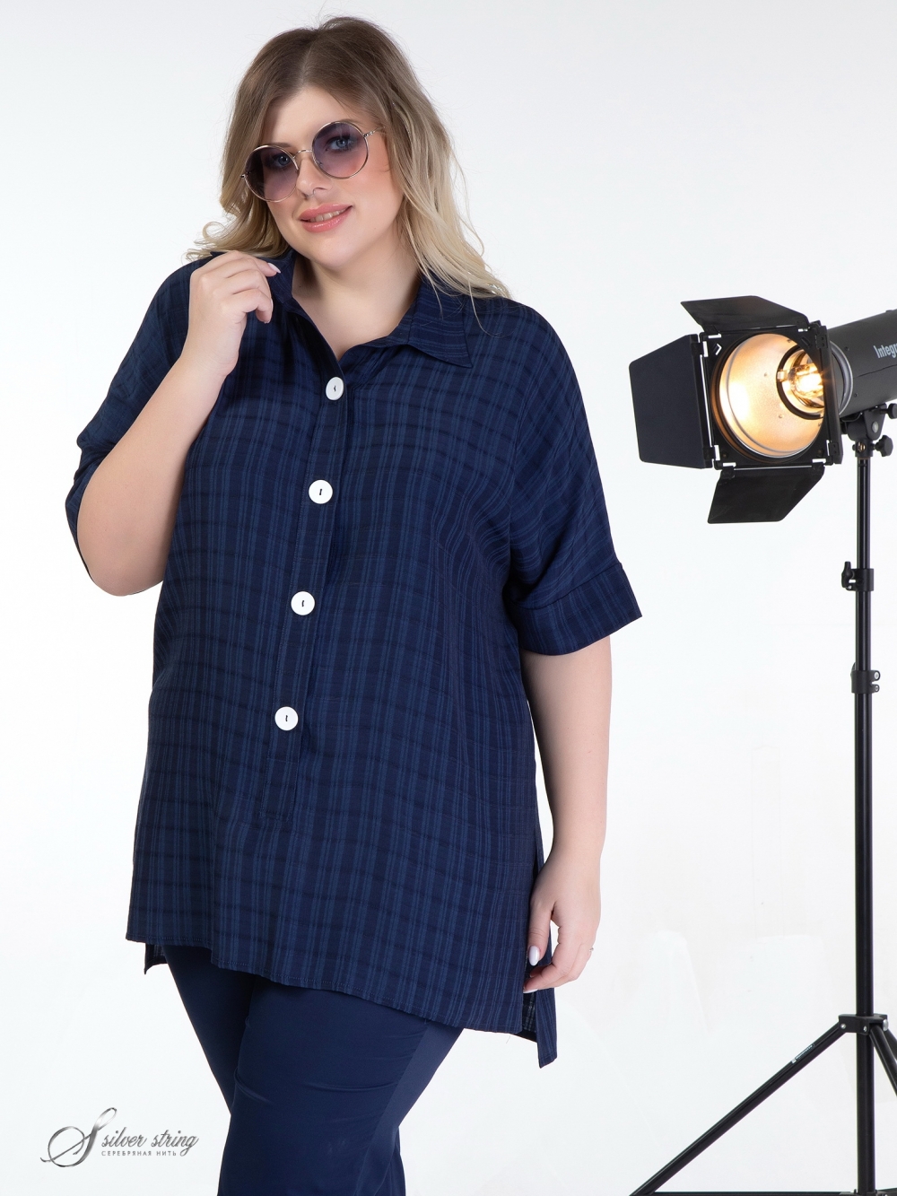 Эффектная блуза Т-образного силуэта выполнена из ткани с высоким содержанием натурального волокна. На гладкокрашеном полотне просматривается выработка в клетку. Модель с рубашечным воротником на стойке и цельнокроеным рукавом длиной до локтя. На полочке расположена застежка-поло на контрастные пуговицы. Низ изделия оформлен асимметрично: спинка длиннее, чем полочка. В боковых швах обработаны высокие разрезы. Модель отлично скрывает проблемные зоны, а оригинальный дизайн позволит выглядеть модно и стильно.