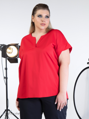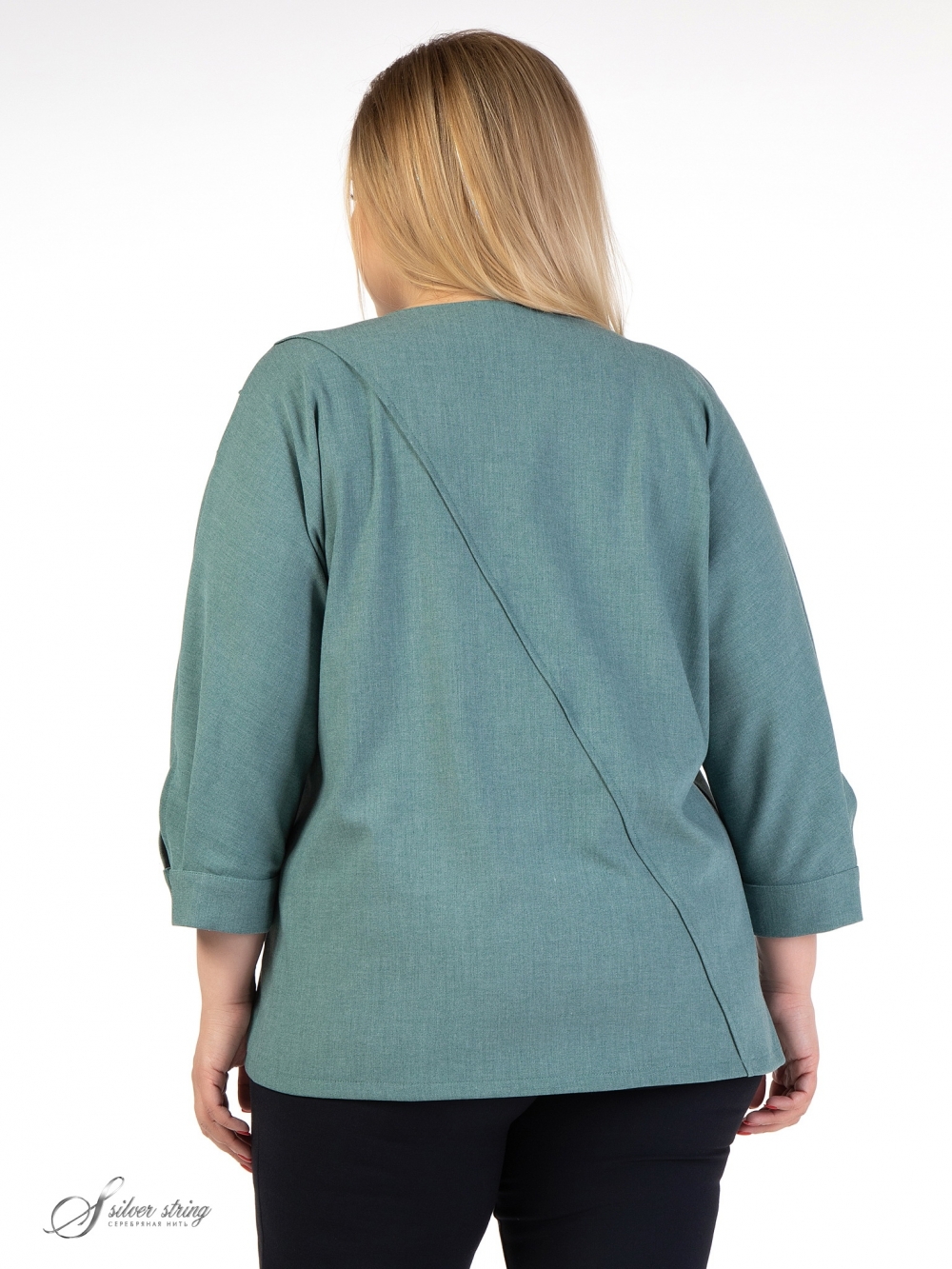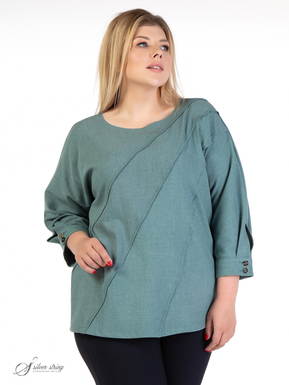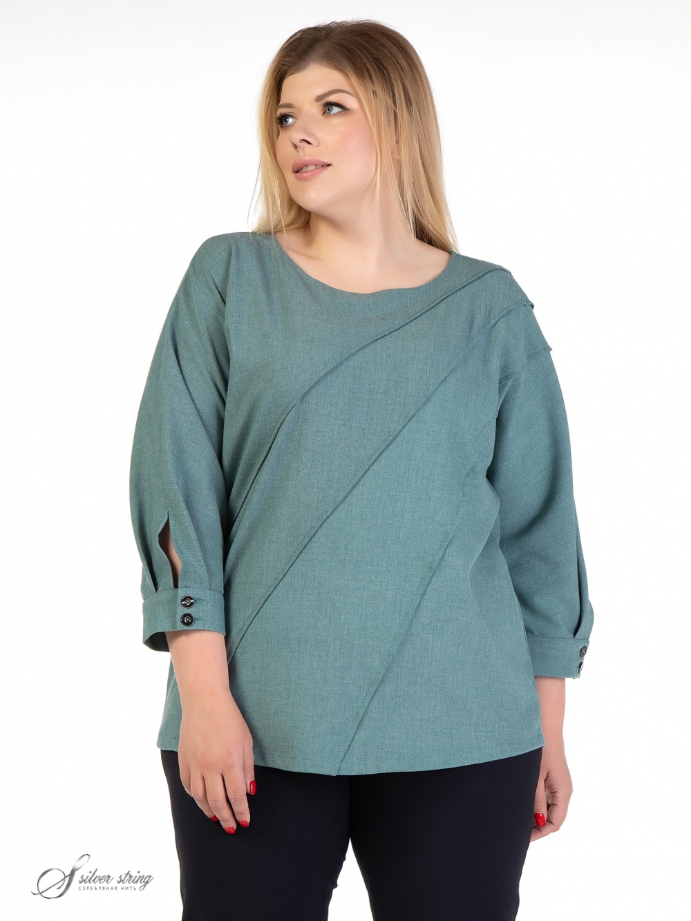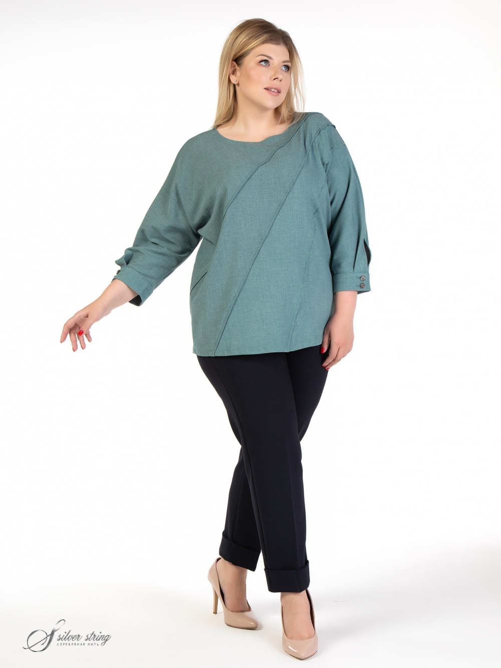 Стильная блуза Т-образного силуэта выполнена из смесовой ткани с большим содержанием натурального волокна. Модель с рукавом покроя кимоно, длиной за локоть. Низ рукава обработан притачной манжетой с застежкой на пуговицы. Линия горловины округлой формы, слегка расширена к плечам. Спинка разделена диагональным подрезом. Полочку пересекают сразу три диагональных луча. Благородный материал и стильный дизайн делают модель изысканной и элегантной.