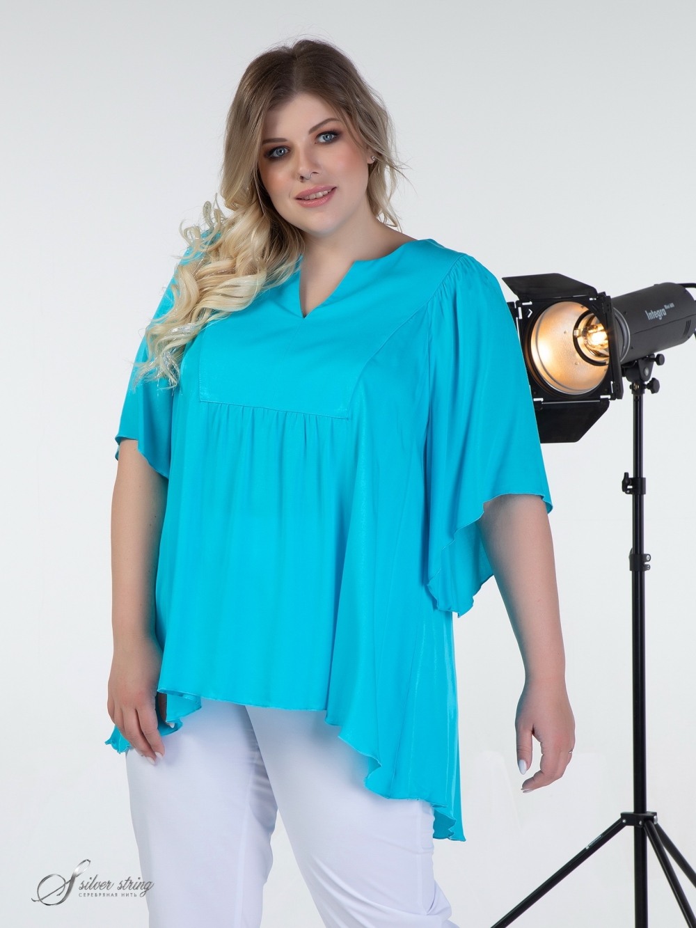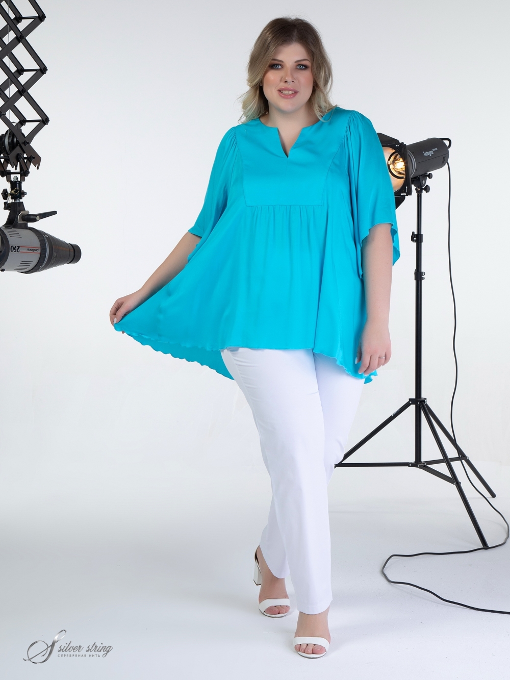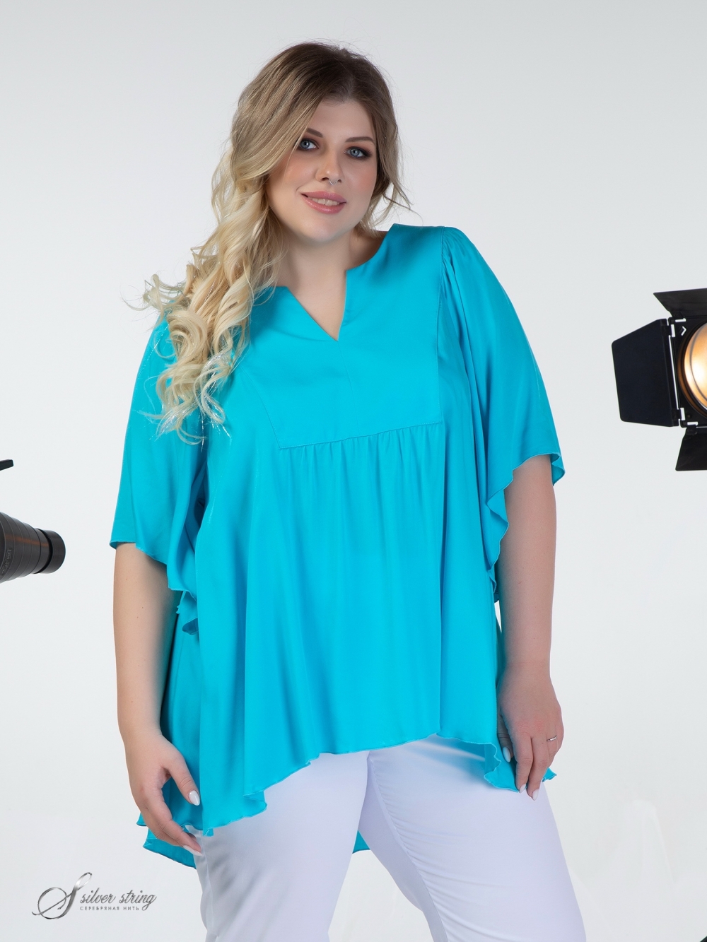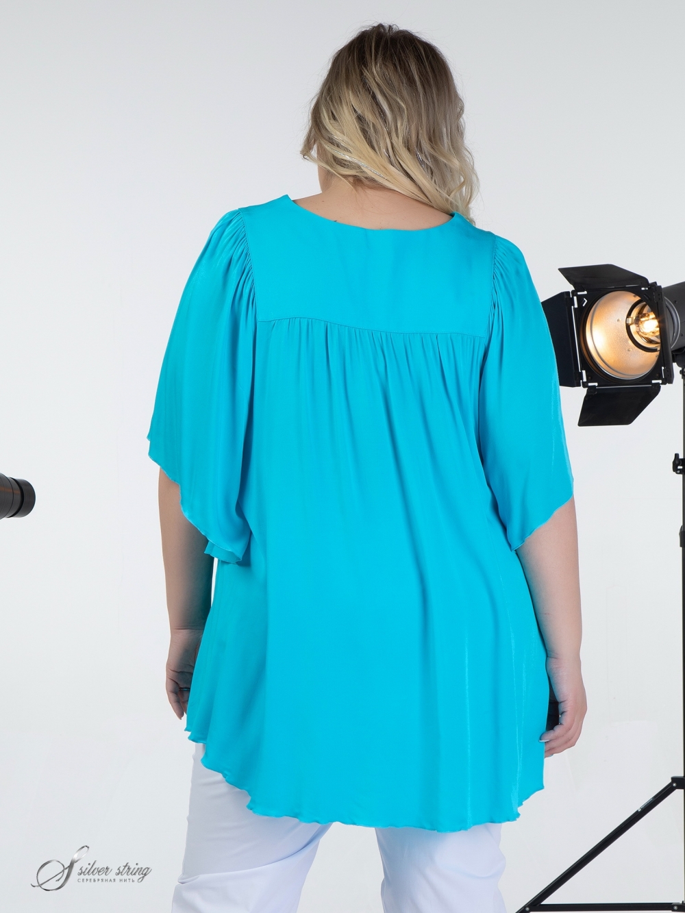 Яркая туника свободного силуэта, с рукавом длиной за локоть, выполнена из легкой ткани с высоким содержанием хлопка. Сатиновое переплетение нитей в полотне, придает материалу бархатистость и приятный блеск. Горловина округлой формы с V-образным вырезом по центру. На полочке и спинке расположены прямоугольные кокетки. Объемный рукав-«крылышко» присобран в области плеча. Сборка проходит и по линиям кокеток. Блуза выполнена в романтическом стиле, она прекрасно маскирует проблемные места фигуры и рук, создавая ощущение комфорта и свободы.