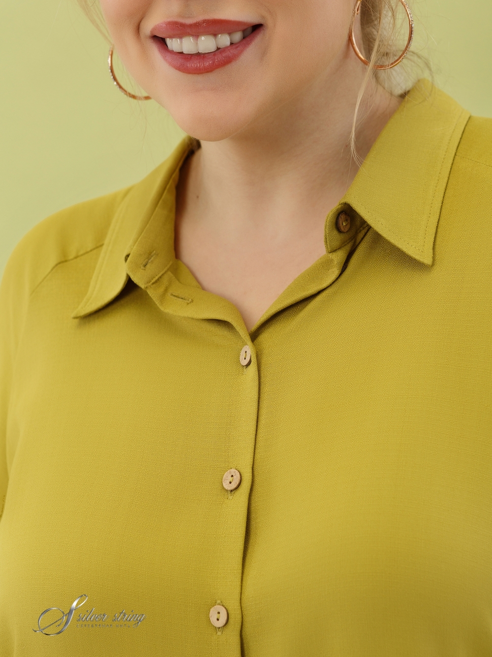 Невесомая Блузка прямого силуэта изготовлена из фактурной ткани с высоким содержанием вискозного волокна. Модель с рукавом покроя реглан длиной до локтя. Низ рукава оформлен в виде отворота. По борту обработана застежка на пуговицы, изготовленные из кокосовой скорлупы. Воротник рубашечный, на стойке. Изделие с асимметричной линией низа: спинка удлинена относительно полочки. Такой крой отлично маскирует проблемные зоны, стройнит и вытягивает фигуру. В боковых швах обработаны разрезы. Модель отличают простой силуэт, мягкие линии и отличная ткань, поэтому Блузка, безусловно, станет базовой вещью в Вашем гардеробе.